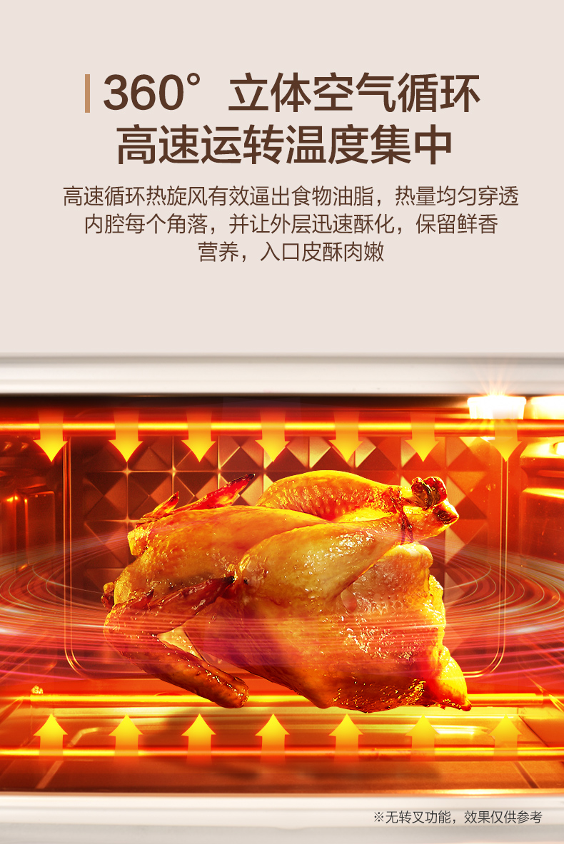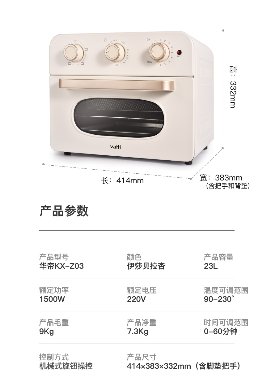 集空气炸锅+烤箱的功能于一体,既可以作为普通烤箱使用,也可以当作空气炸锅实现无油炸,23L容量,可容纳2个9寸PIZZA,1个8寸蛋糕,40个葡式蛋挞,20只生蚝,容量可观。
