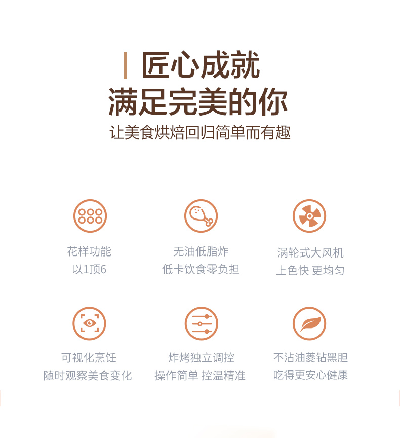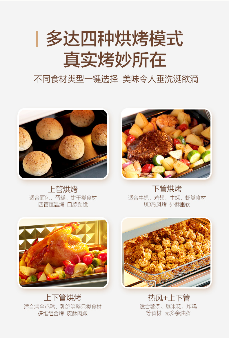 4种烘焙模式,上管独立烘烤、下管独立烘烤、上下管一起、热风+上下管(空气炸锅不用油)不沾油菱钻涂层内胆,搪瓷烤盘,方便易清洁。