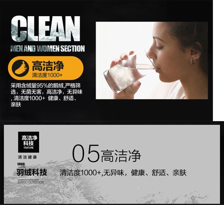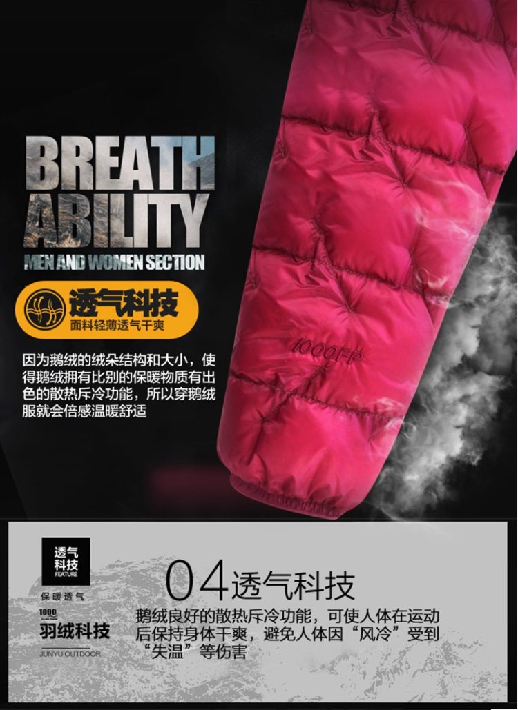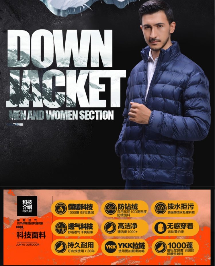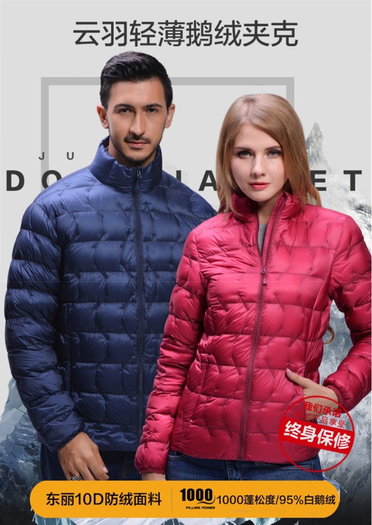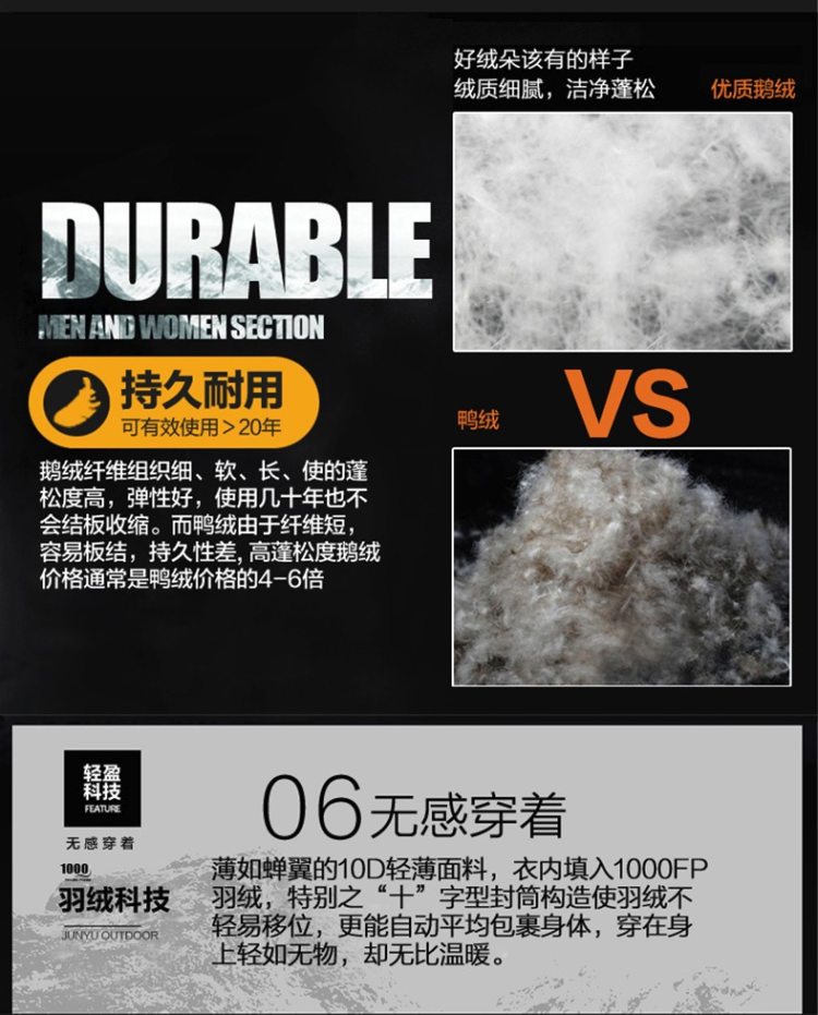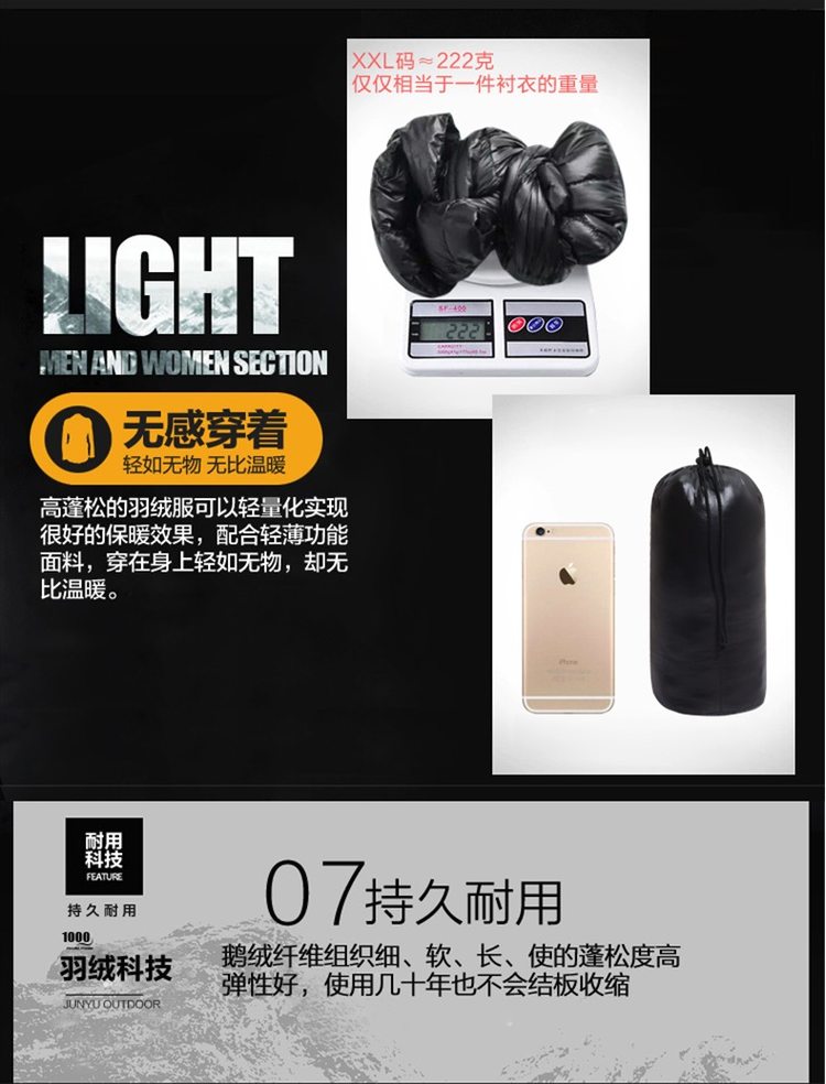 1000蓬是羽绒服的终极信仰,当下最高蓬松度,蓬松度是衡量羽绒品质最核心的指标。君羽这款是羽量级超轻羽绒服,填充1000蓬鹅绒,含绒量95%,男款L码充绒量65克。