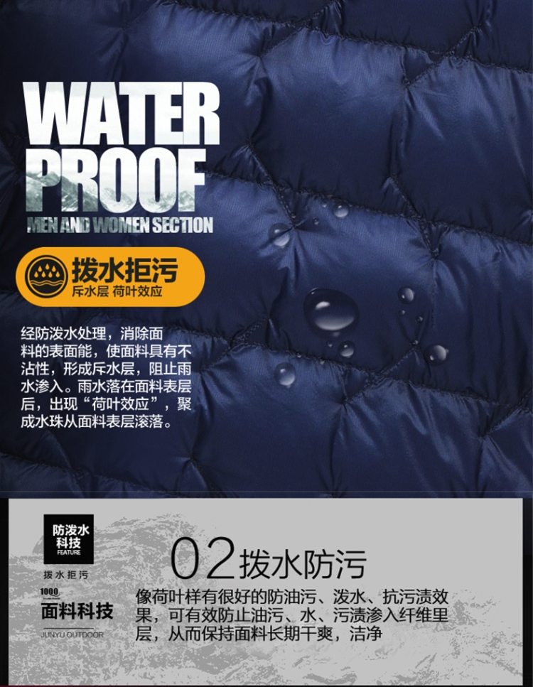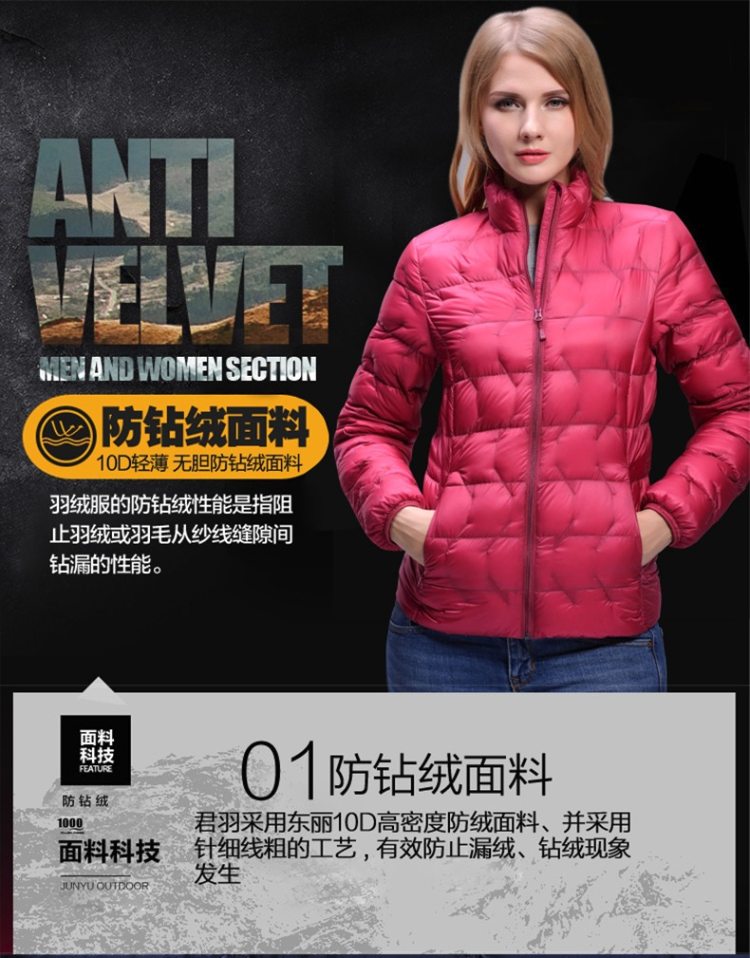 面料是极薄的10D尼龙面料;采用先车出羽绒隔舱后充绒的方式,缩绒针细针眼搭配粗线的防钻绒工艺;十字形羽绒隔舱,避免羽绒移位长效保暖。