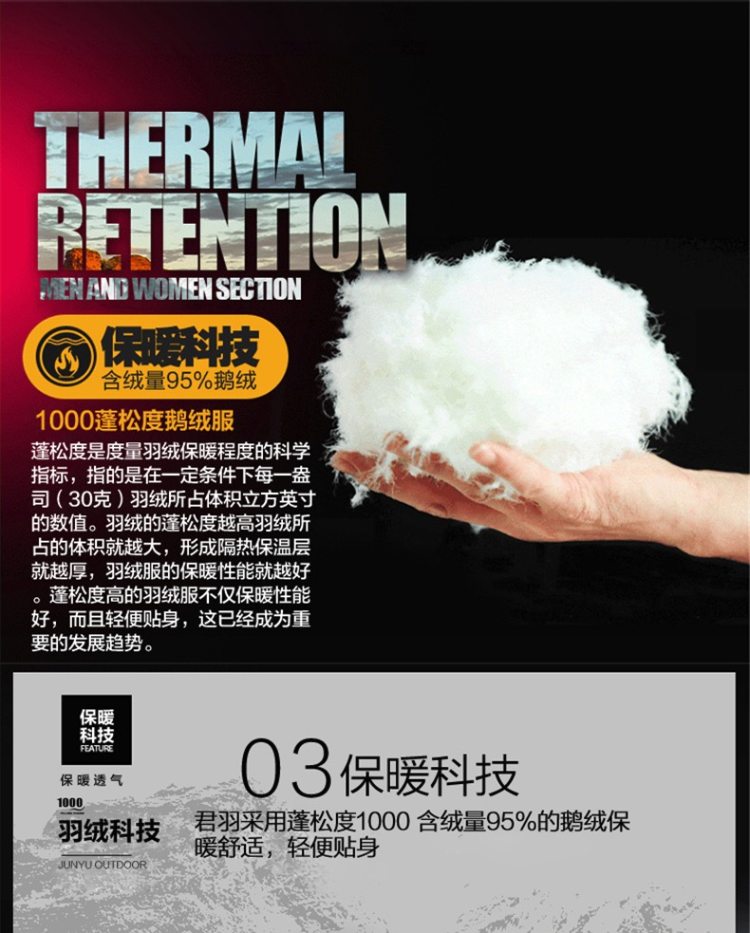 在保暖效果上,这款羽绒服男款L码填充65克鹅绒≈「95克 800蓬高蓬鹅绒」≈「125克 700蓬普通鹅绒」≈「180克普通鸭绒」。