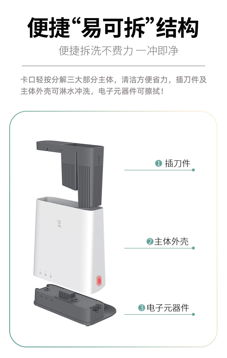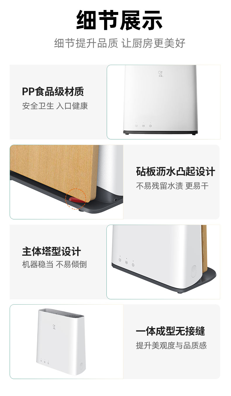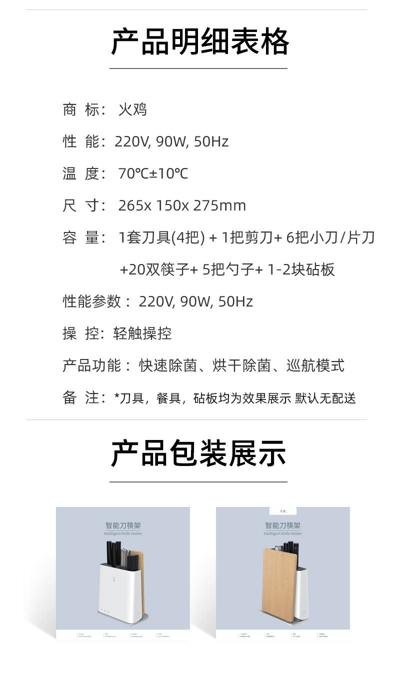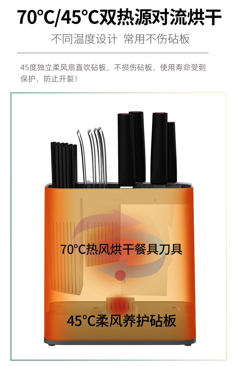 火鸡消毒刀架,通过紫外线和高温双重杀菌,具有2个紫外线光源和双热源,破坏病毒和细菌的生长环境,卫生安全,70℃的热风能够快速烘干餐具刀具,外部45℃的柔风养护砧板,放置开裂。