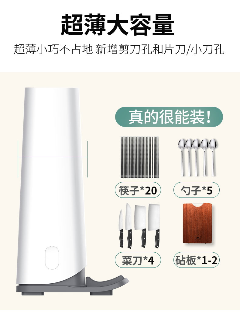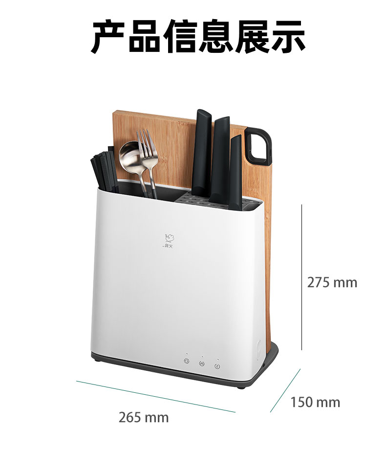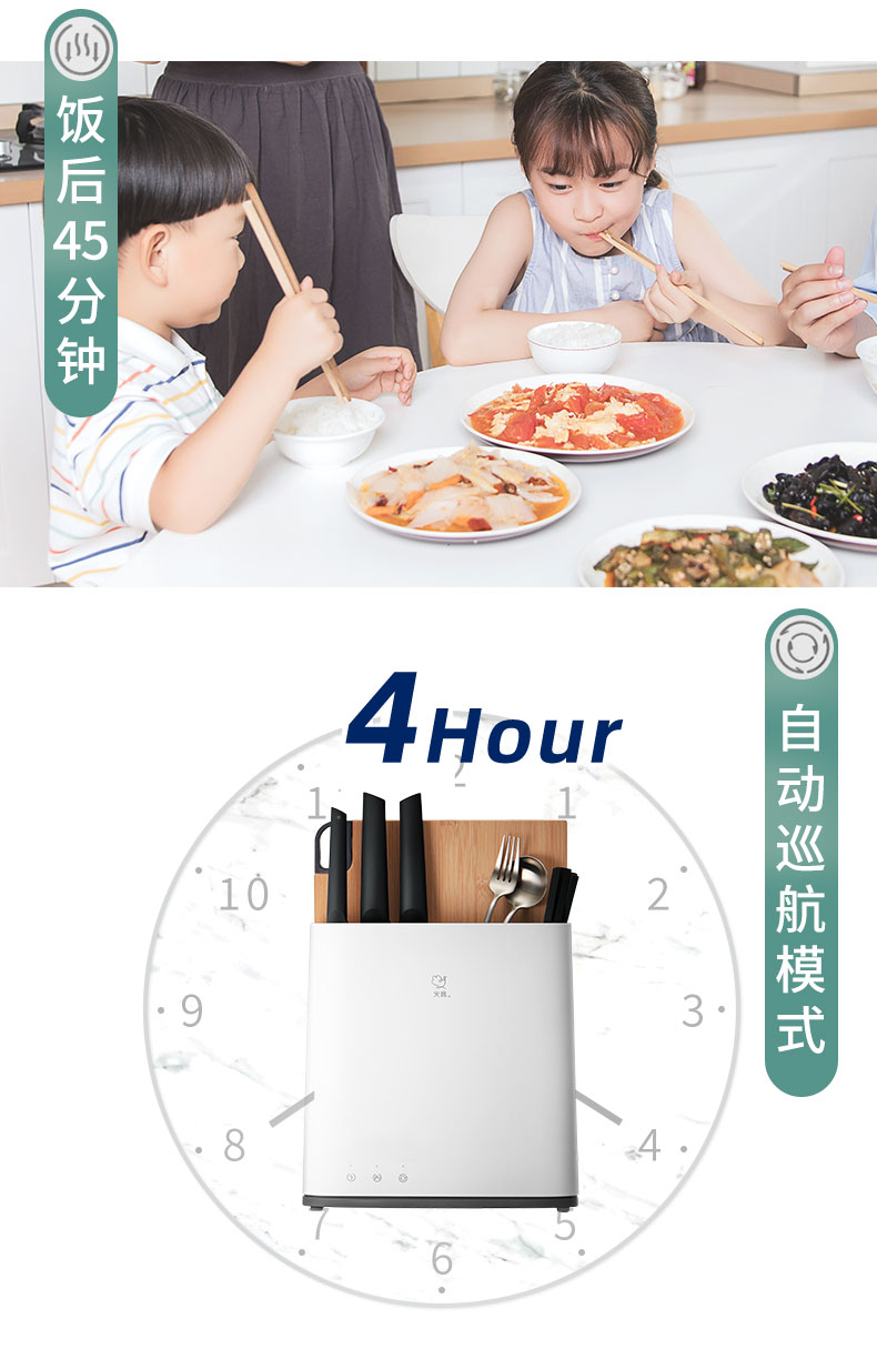 什么材质的刀具、筷子都可以盛放,木筷、竹筷、金属筷均可以。具有4小时巡航杀菌的功能,长按即可开启。对卫生要求更高的家庭也可以满足。
