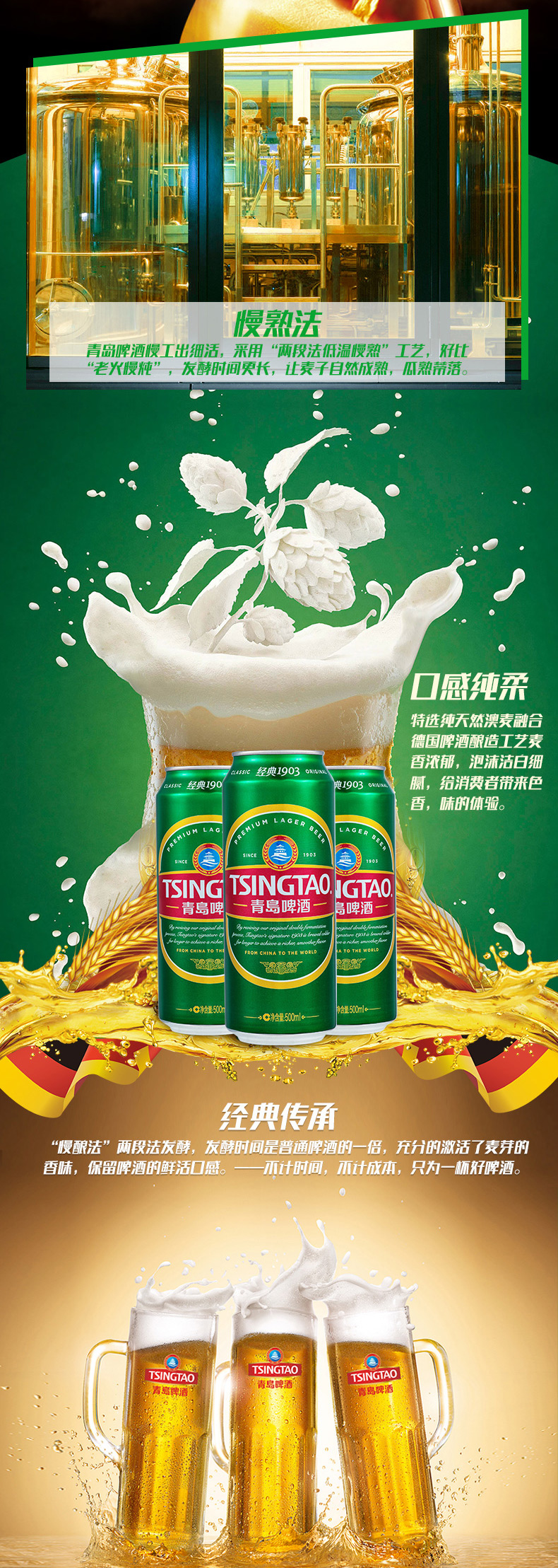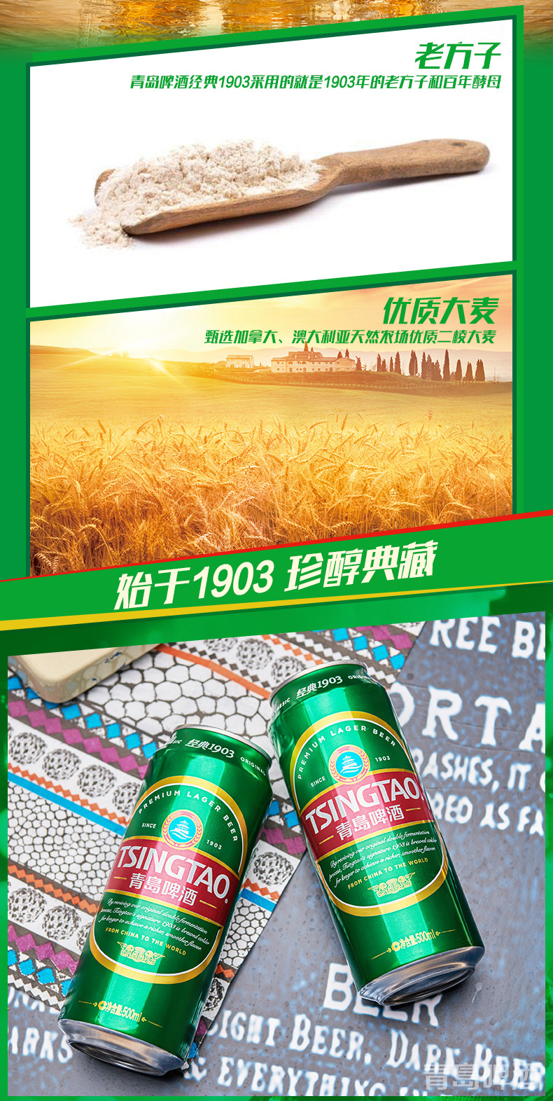 青啤最经典的1903精酿啤酒,选用优质大米、麦芽、上等啤酒花酿制、原麦汁浓度为10度,酒精含量4.0%。酒液清澈透明、呈淡黄色,泡沫细腻洁白、麦香浓郁,酒体沉厚柔和,香醇爽口。规格:500ml*18听。