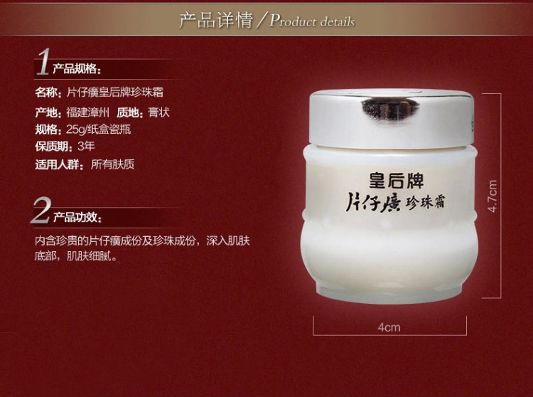 这款皇后牌 片仔癀珍珠霜,含珍贵的片仔癀成份及珍珠成份,深入肌肤底部,从细胞进行修复,真正从根源解决肌肤的斑痘暗沉、坑疤痘印、毛孔粗大等问题,还肌肤美白细腻,粉嫩光泽。规格是25g*3瓶。领券链接点此