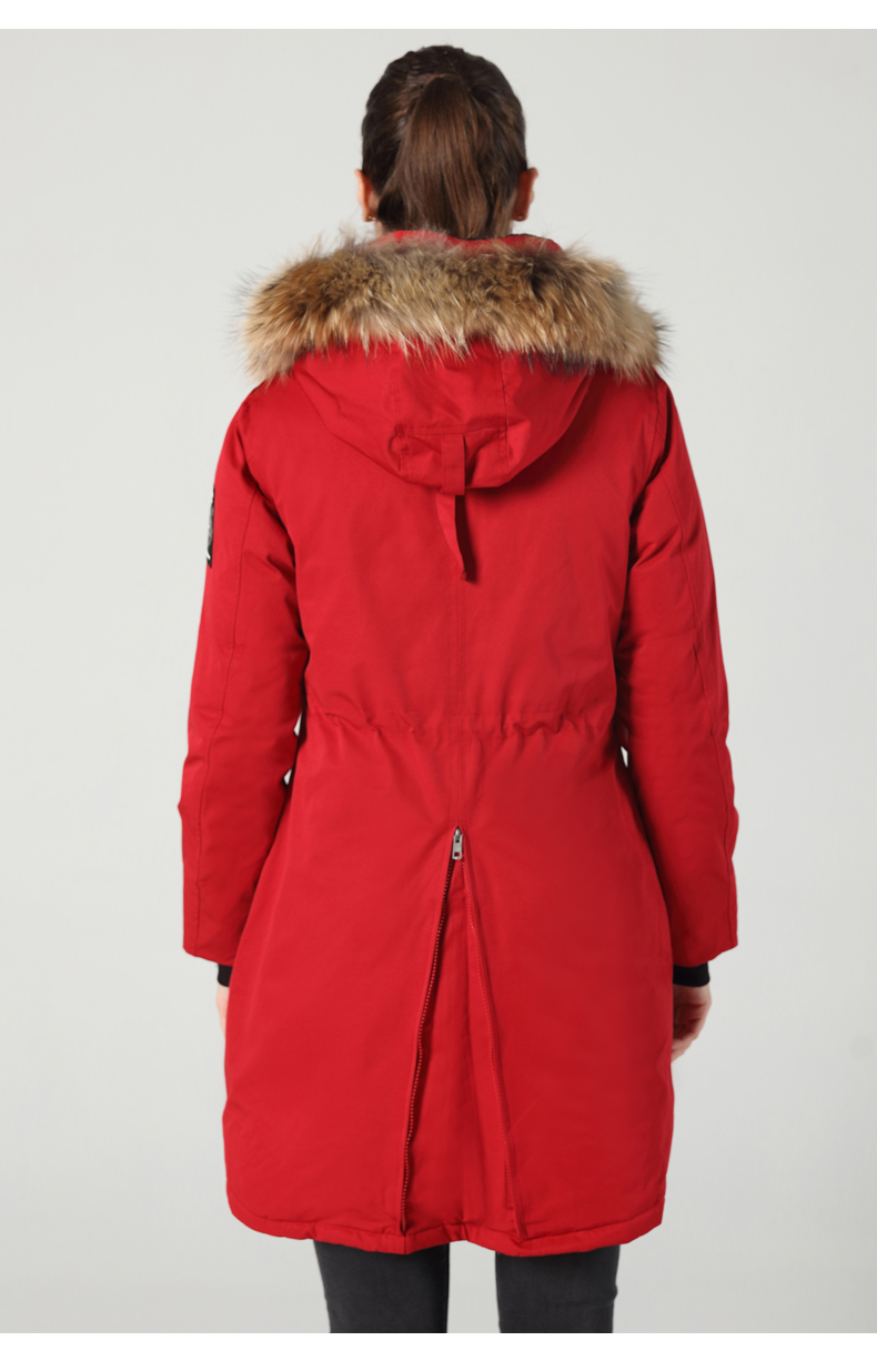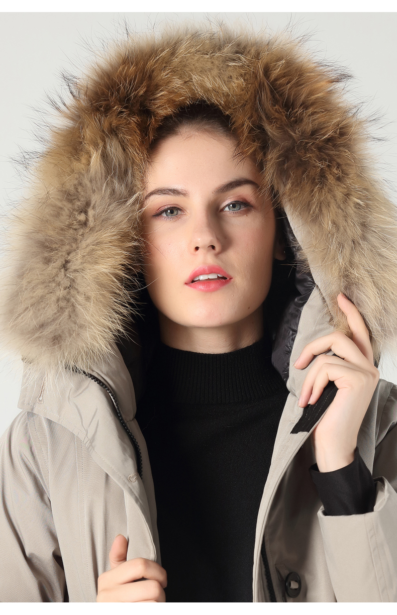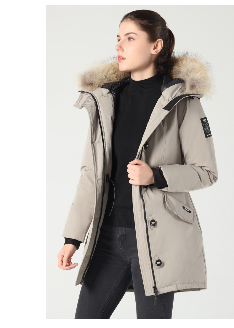 这款君羽雪松中长款羽绒服,属于酷寒款,可抗-15℃~-30℃,是2019年的冬季新款,内里填充了800蓬90%鹅绒,充绒量男L码210克/女M码180克,属于重装羽绒服了,外层是贴膜防绒布面料,可防风防雨雪。直筒微收腰版型,长度过臀及大腿。