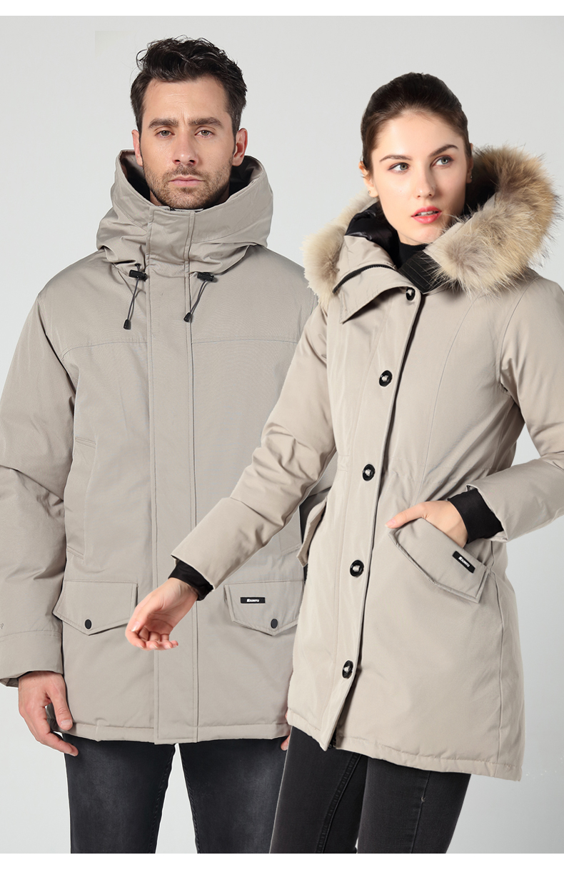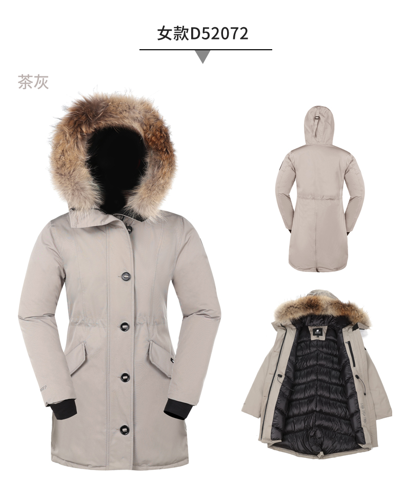 在款式和细节方面,男直筒/女修身版型,羽绒服是连帽设计,女款帽檐一圈有用拉链连接的大貉子毛领,后下摆有拉链,可拉开。双头主拉链和纽扣组合的双门襟,有着更好的保暖效果,所有拉链都是YKK的,防风保暖袖口,帽子用魔术贴调节前后幅度。
