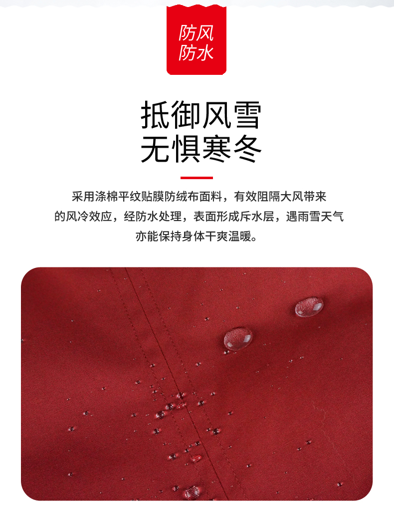 外层面料上,使用61%聚酯+39%棉混纺的平纹贴膜防绒布面料,能很好的防风,还经过防污抗泼水处理,可以保持面料长期干爽、洁净。羽绒采用先车出羽绒隔舱后充绒的方式,缩绒针细针眼搭配粗线的防钻绒工艺。