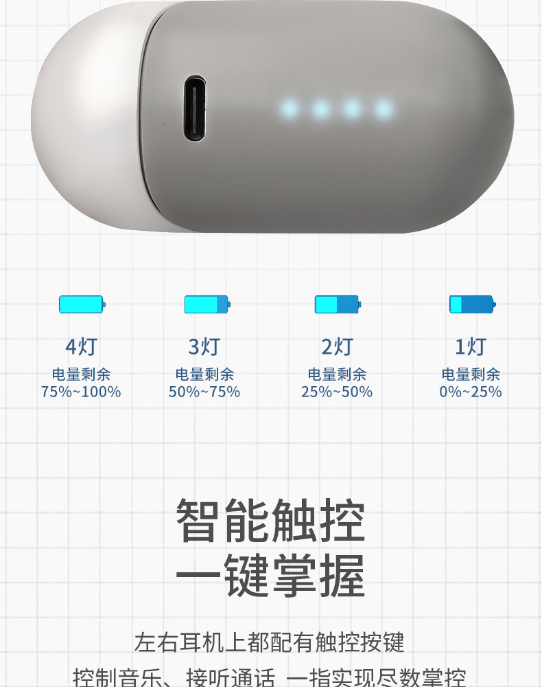 6mm驱动单元,高清麦克风。16+4超长续航,耳机盒可充四次电。单个耳机约4g重,佩戴舒适无压迫感。支持记忆配对,防误触按键设计,兼容市场上99%的手机、电脑、平板等电子产品,IPX5级防水防汗。