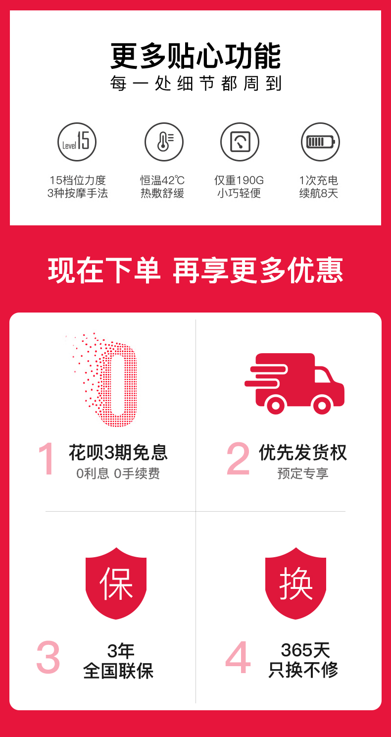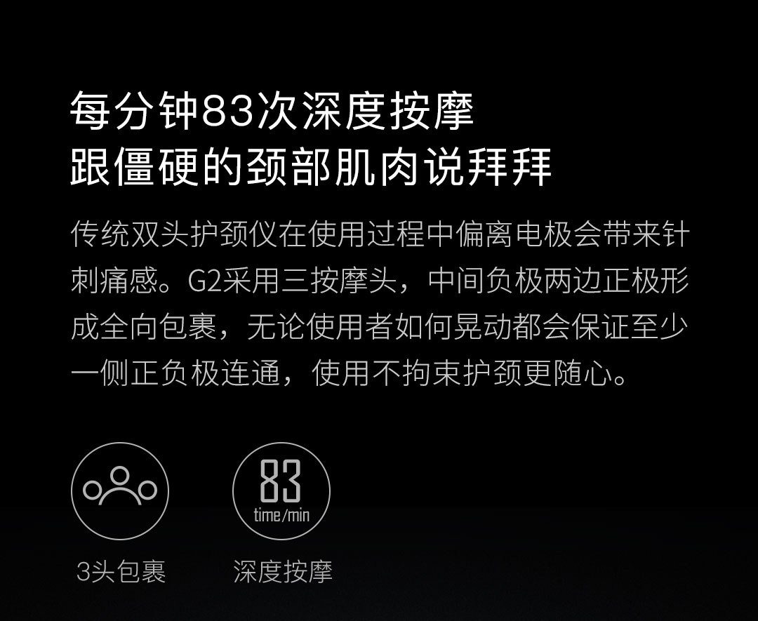 【小乔集团出品】采用L 型围巾设计,三头脉冲按摩,重量也只有190克重。具有TENS 脉冲、双效热敷、L型佩戴等特点,采用 Type-C 口充电,在充满电情况下,每天使用30分钟能够使用8天。TENS脉冲技术利用特定频率的脉冲电流模仿手法按摩,通过微电流模拟人工按摩的捏、揉、捶、压、拍等方式。
