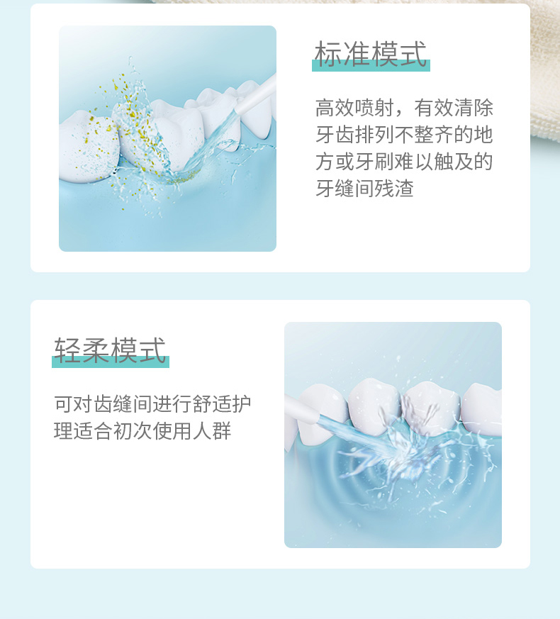 1.轻柔模式,可对齿缝间进行舒适护理,适合初次使用人群。