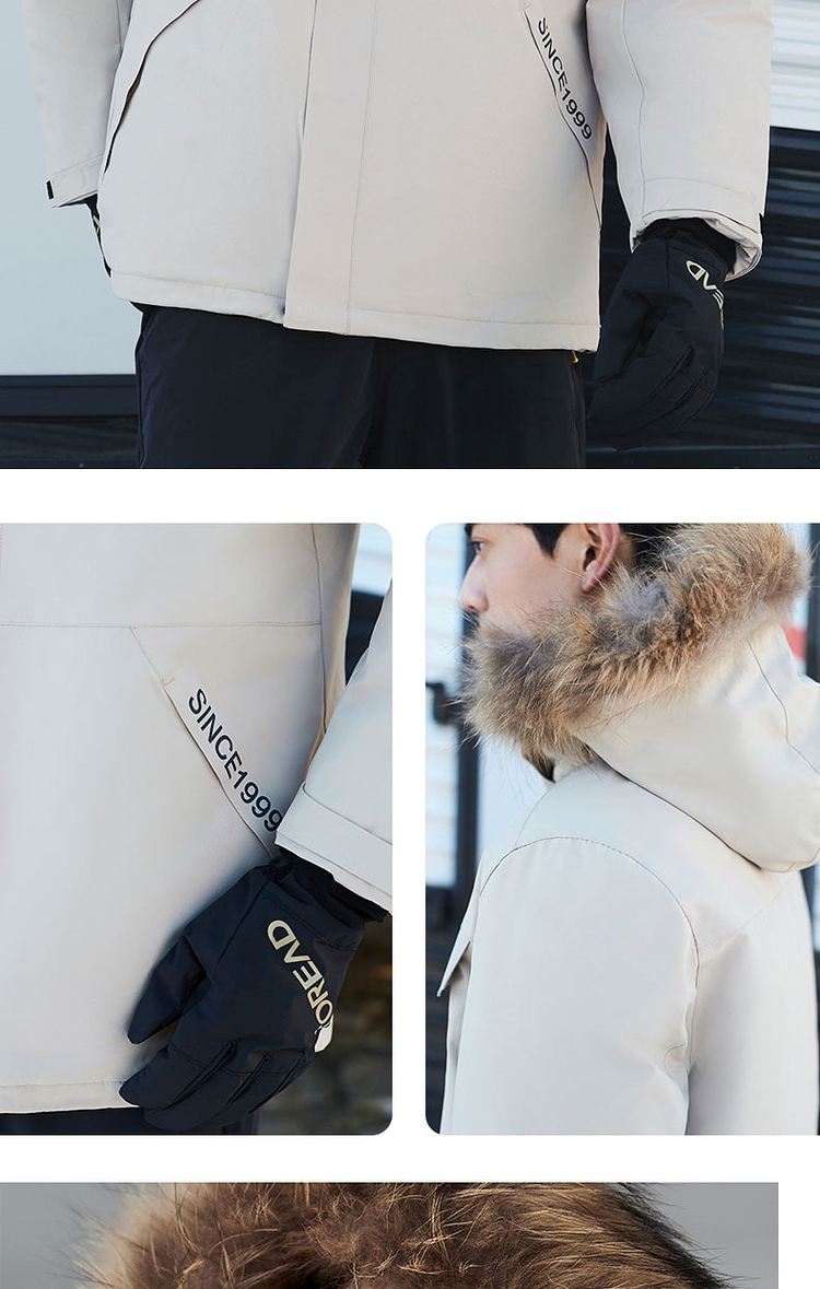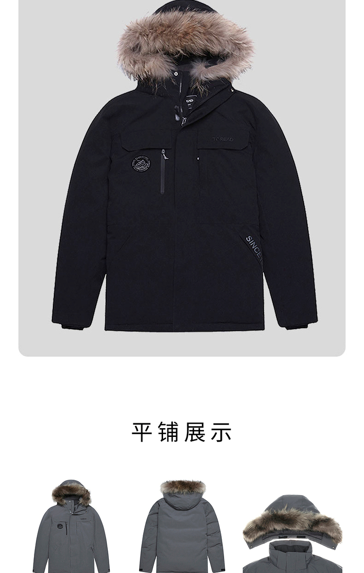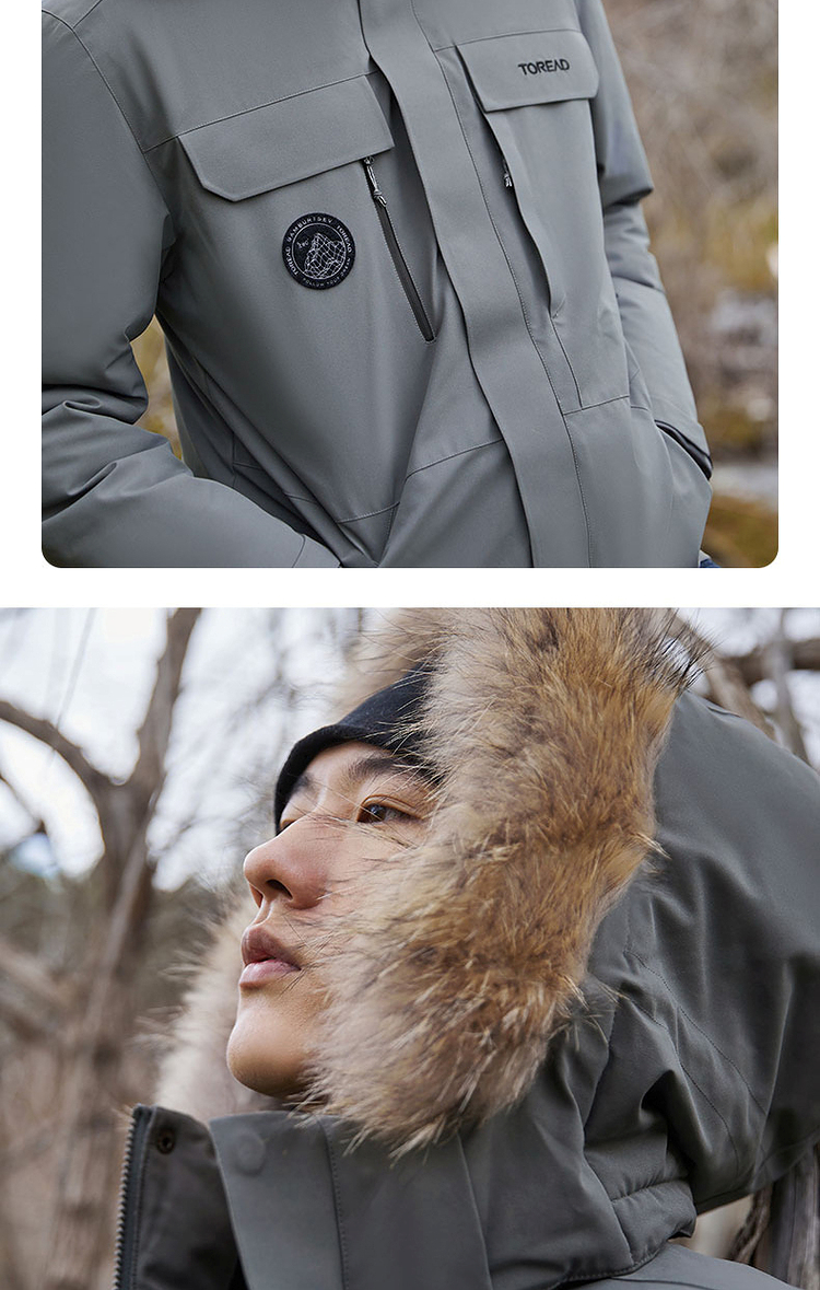 羽绒服外层使用了棉涤仿绒面料,防风保暖,防泼水,具有化纤面料高强度的优势,整体塑形感好,同时具有一定的弹性,穿着不束缚;内里双层羽绒胆布,不易钻绒,耐穿好打理;帽毛位置为真貉子毛领,柔软舒适,保暖性好,有效防止寒风扎脸。