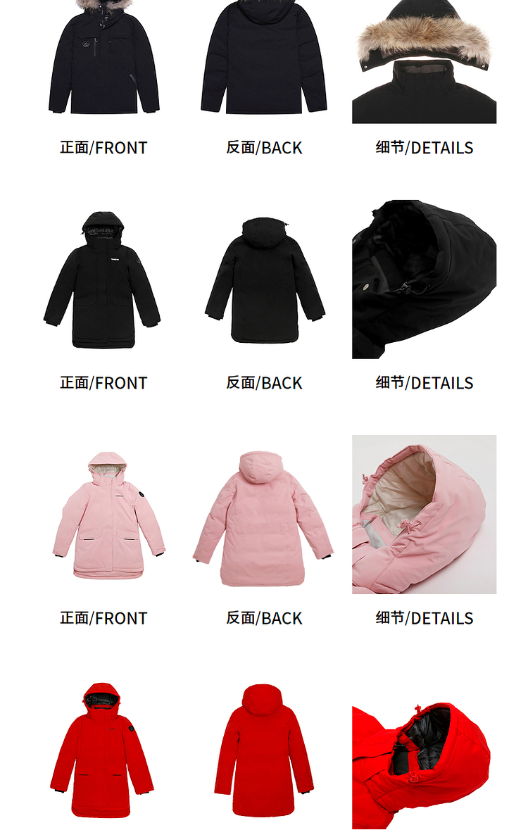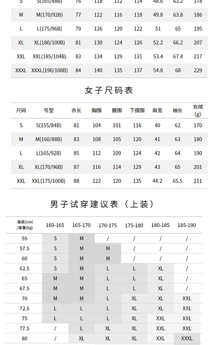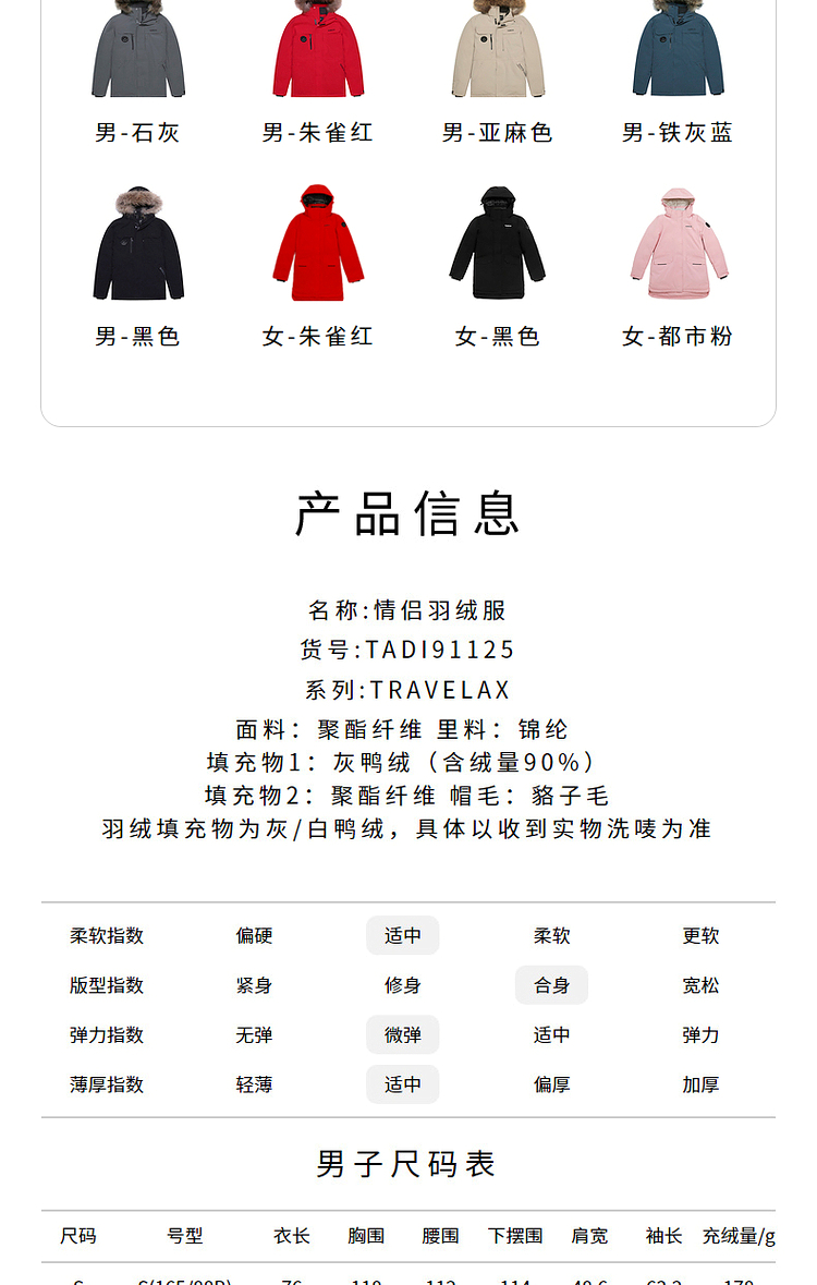 羽绒服核心的羽绒和充绒量方面,填充了90%的鸭绒,男女款XL码的充绒量都达到了200g以上,是中厚款羽绒服,适合-20℃以上的环境穿着。