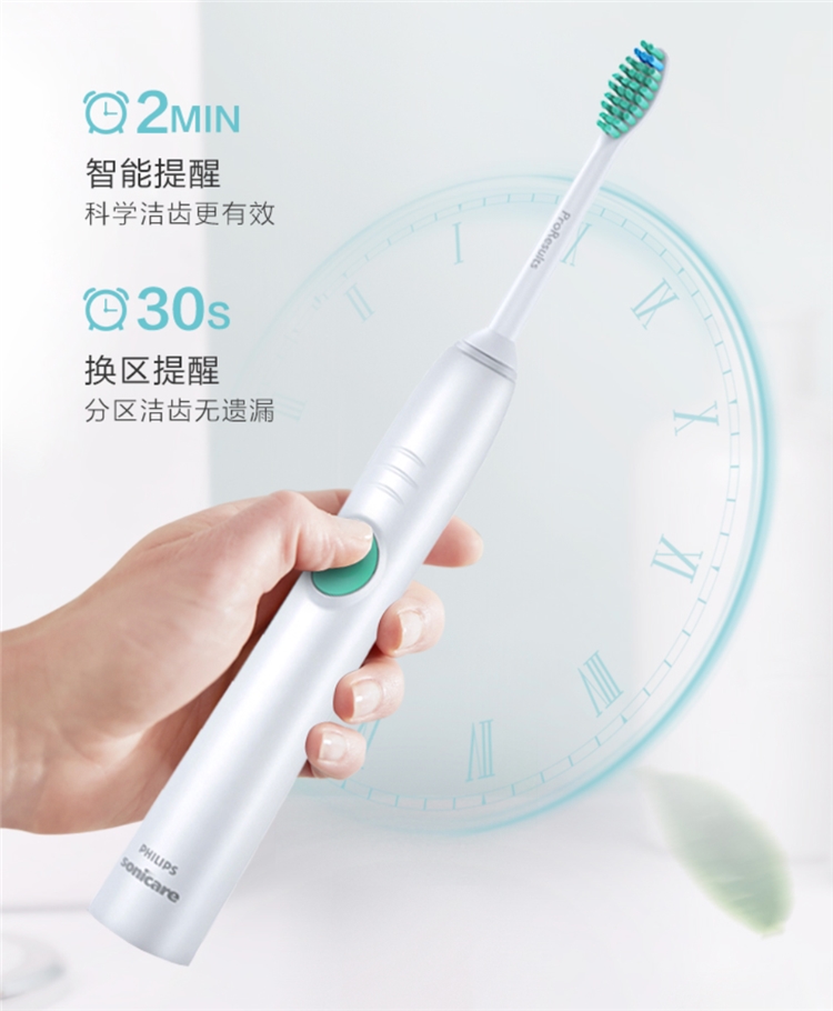 有种贴心守护是从初次相见开始,动力增强程序呵护着你,前14次使用循序渐进去提升清洁的力度,做到有效的清洁又能让你享受到舒适感。有一种简单的陪伴叫早晚两分钟,还采用了智能计时程序,两分钟的智能提醒,科学洁齿更加的有效果;30秒的换区提醒,让你做到分区洁齿无遗漏,效果更佳!