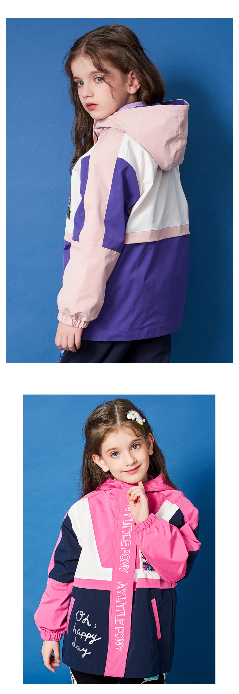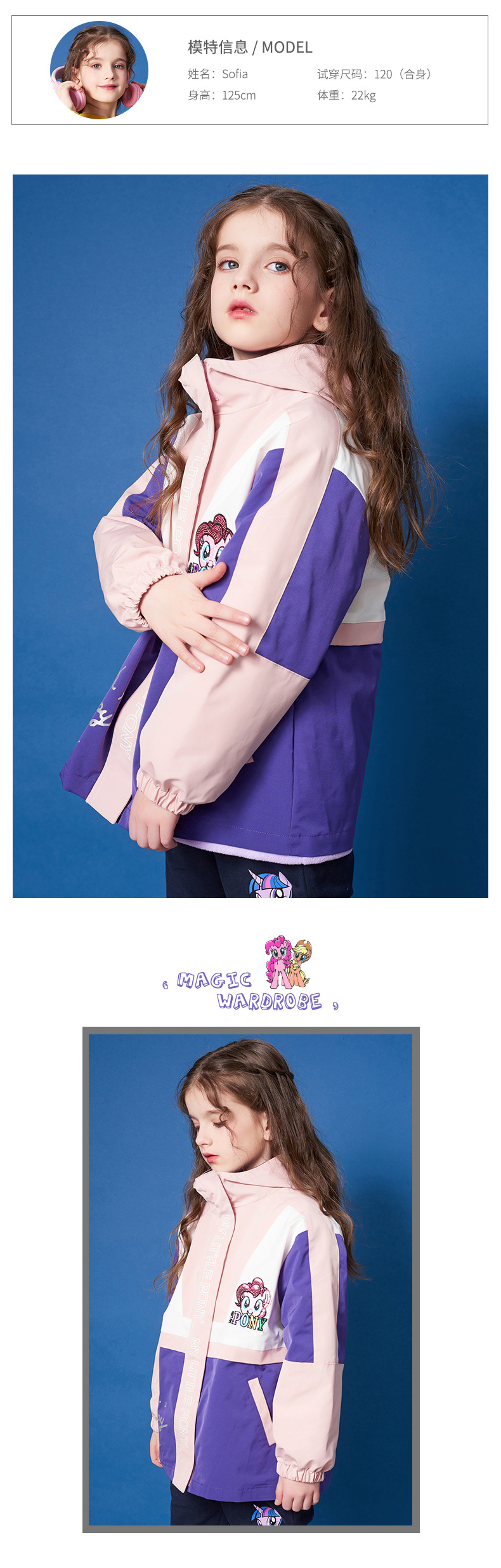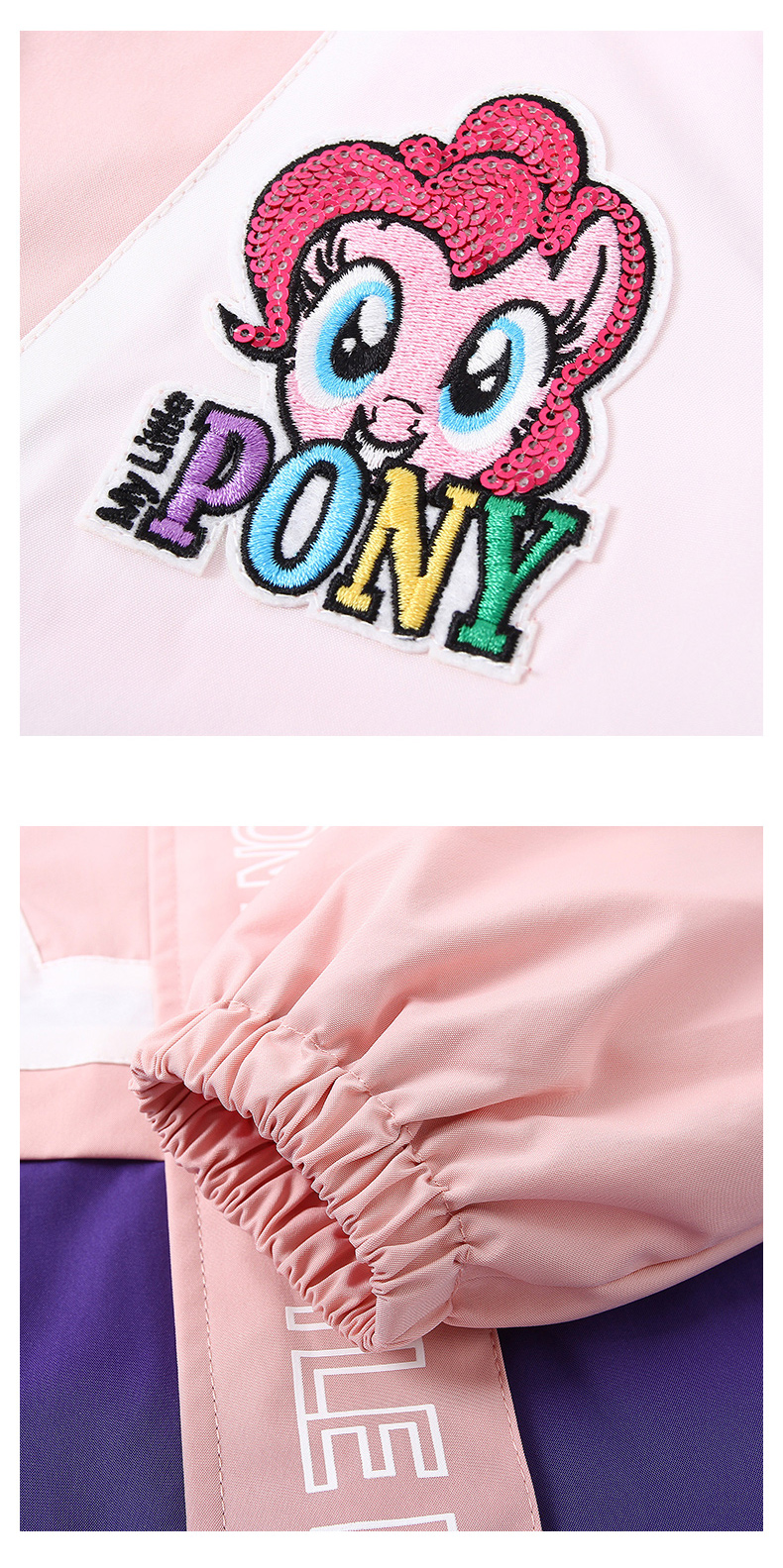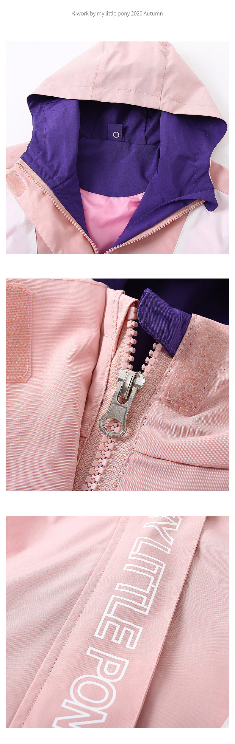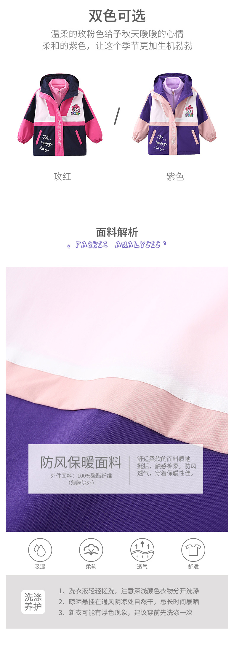 这款小马宝莉女童三合一冲锋衣,是2020年的秋冬新款,外层衣服采用100%聚酯纤维面料,表层还有防水膜,拥有不错的防风、防水效果。