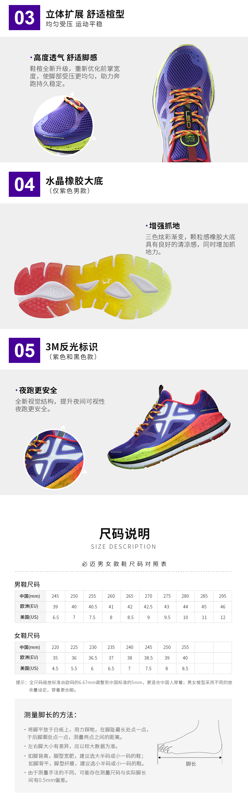 必迈Pace远征者,是为大体重用户设计的长距离慢跑鞋,中底使用超轻配方EVA缓震材料,中底全掌比平常跑鞋厚约1cm,提供轻量优秀的缓震性能,缓解膝盖与脚踝压力。鞋楦优化了前脚掌宽度,鞋面包裹脚掌,使脚步受压更均匀,鞋面还使用3M反光材料,提升夜跑安全性。