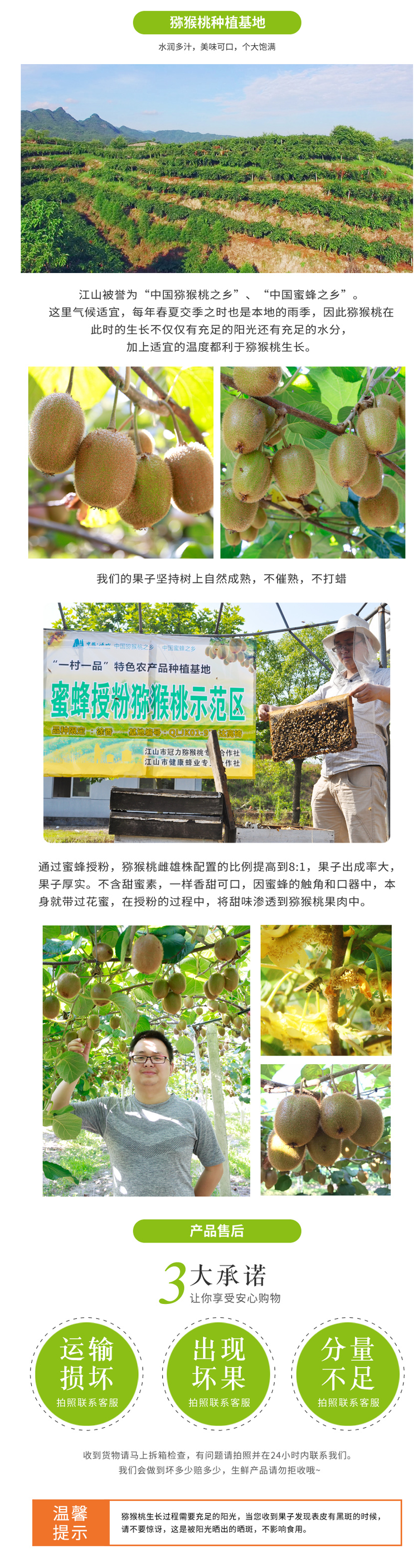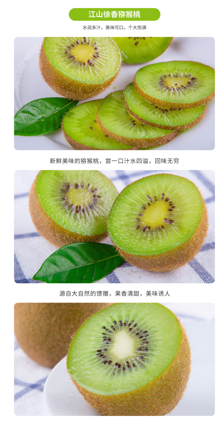 这款江山徐香猕猴桃,产地是浙江江山市,新鲜直采,现摘现发,承诺坏果包赔。果子皮薄肉厚,果肉翠绿,饱满多汁、酸甜怡人,口感绵软,香甜细腻。