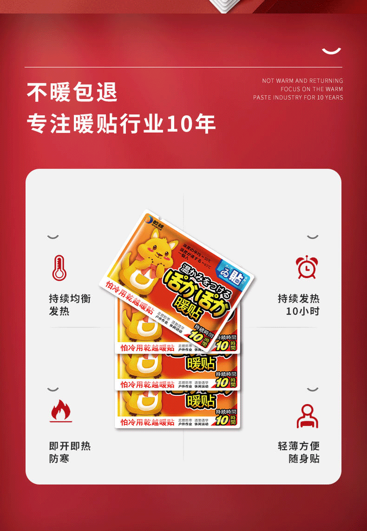 天猫万迈家居专营店10.9元,可领3元优惠券,实付7.9元到手,是正价14.8元的5.9折;可持续发热10小时,平均温度约52℃,背部使用压敏胶,粘性好,不易脱落,采用密封包装,安全防潮,保质期3年。