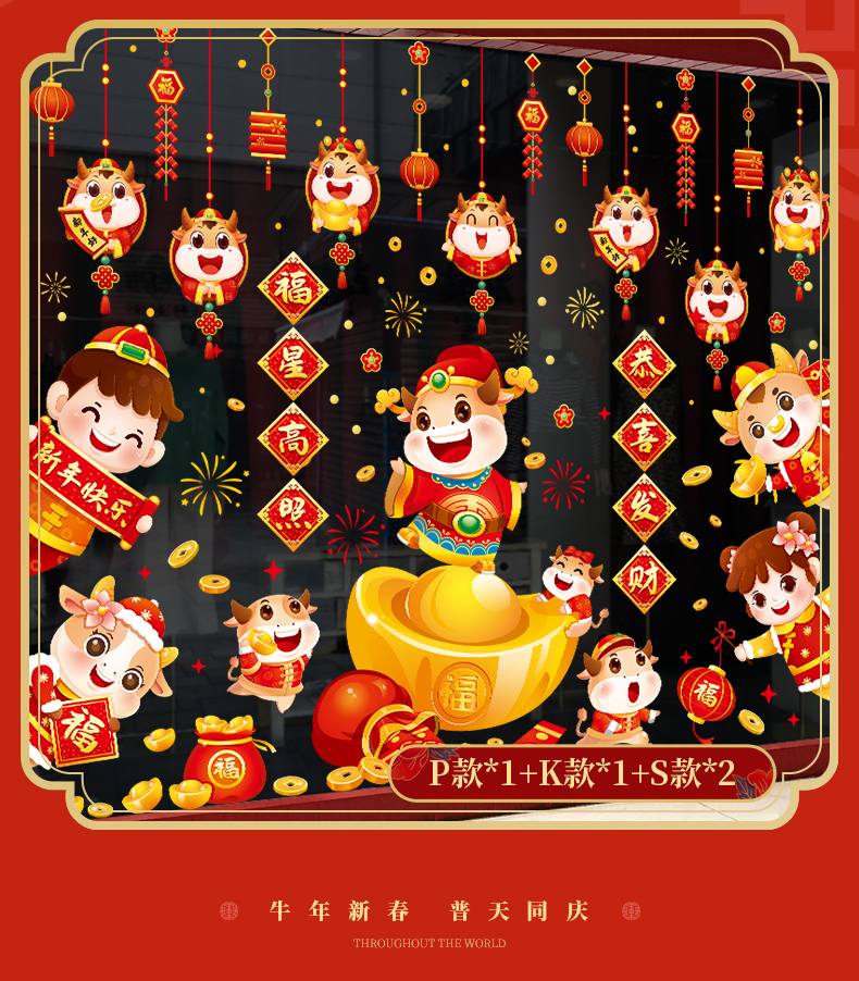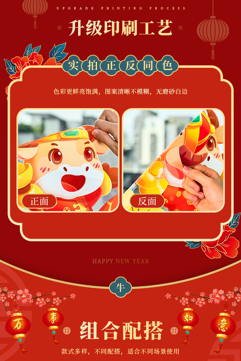 精美新年玻璃门窗贴纸,升级印刷工艺,色彩更鲜艳饱满,图案清晰不模糊,无磨砂百边,商场幼儿园居家装饰,气氛先搞起来牛气旺旺~