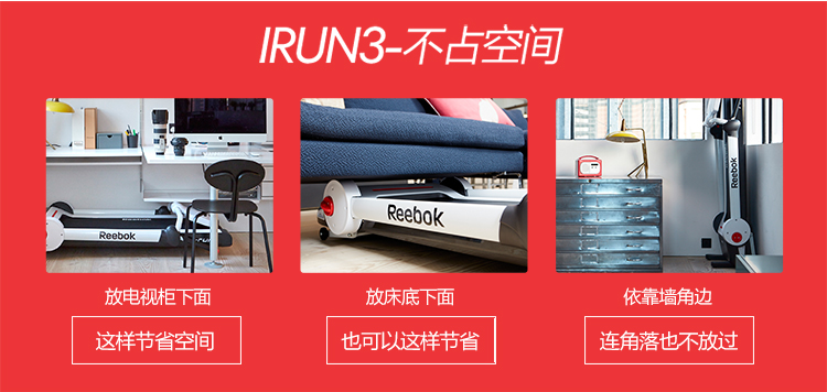 这款锐步IRUN可折叠静音减震跑步机,免安装拆箱即可使用,女生在5秒内都能轻松折叠,占地仅0.25㎡,非常适合居家使用,底部有滑轮可以向拉杆箱一样随意移动。产品经过国家3C认证,质量安全靠谱。