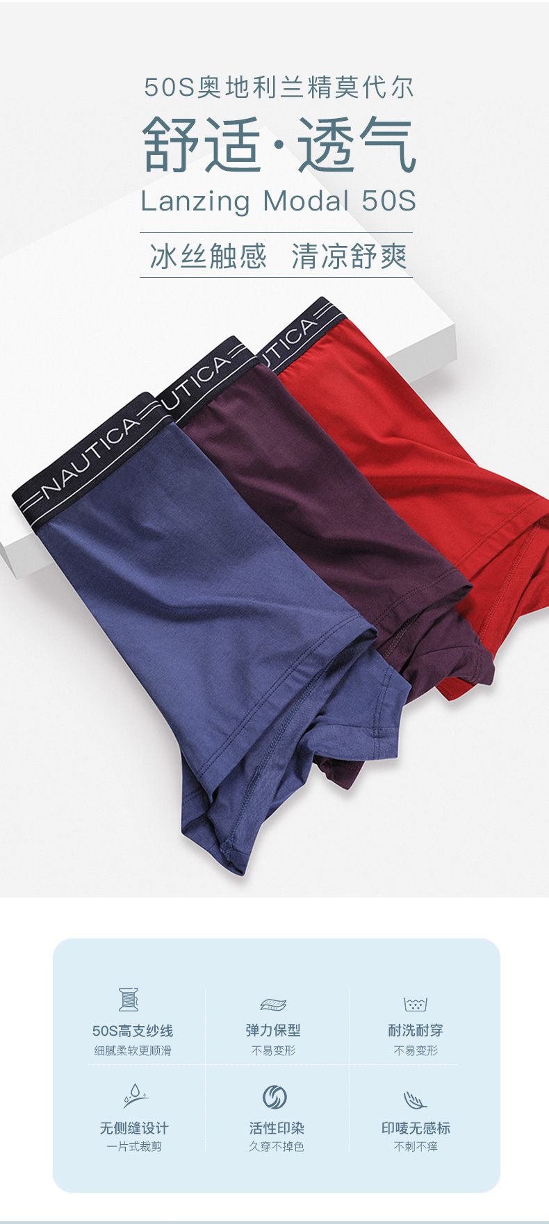 这款诺帝卡平角内裤,采用50S奥地利兰精莫代尔面料,冰丝触感,轻柔无感,清凉舒爽;活性印染,持久如新;高弹明筋腰带,高弹不累腰,久穿不变形;内印无感标签,穿着更舒适。