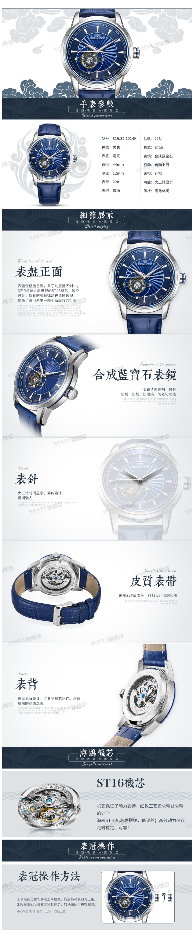这款海鸥Seagull男自动机械表,属于锋芒系列,商务休闲风格,表盘深蓝色基调,条丁刻度整齐划一,ST16机芯位于6至9点位之间,镂空设计,旋转的机械律动被清晰透视,像极了银河系里一颗不断旋转的行星,简约大三针、透明表底。