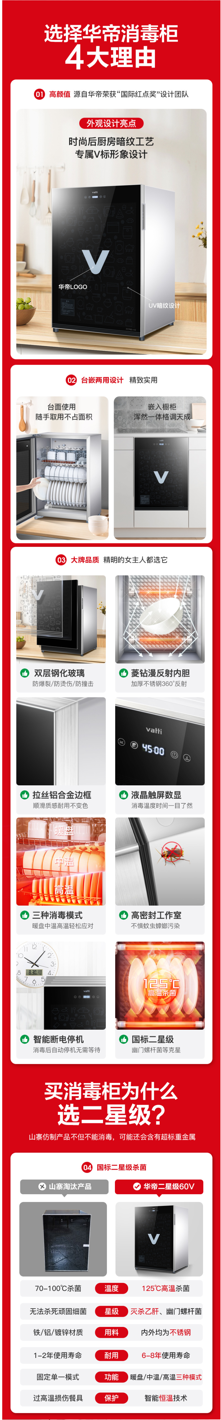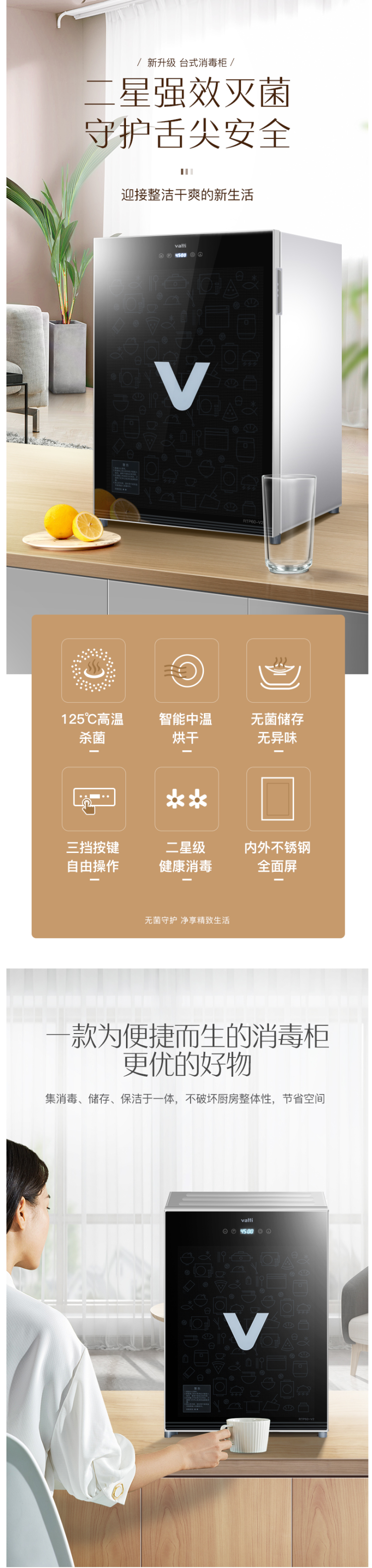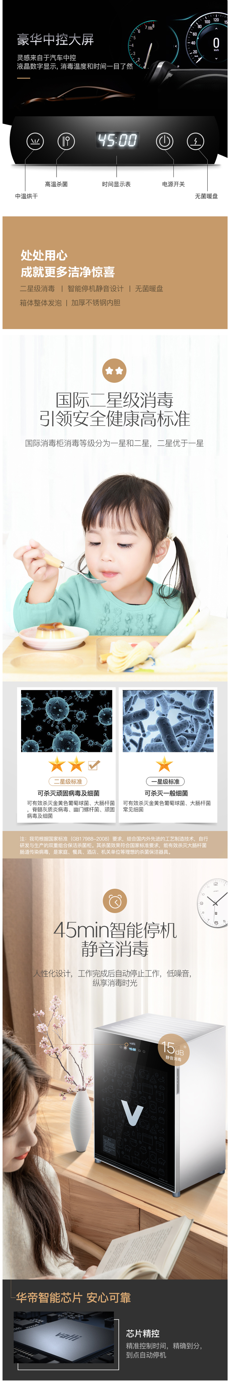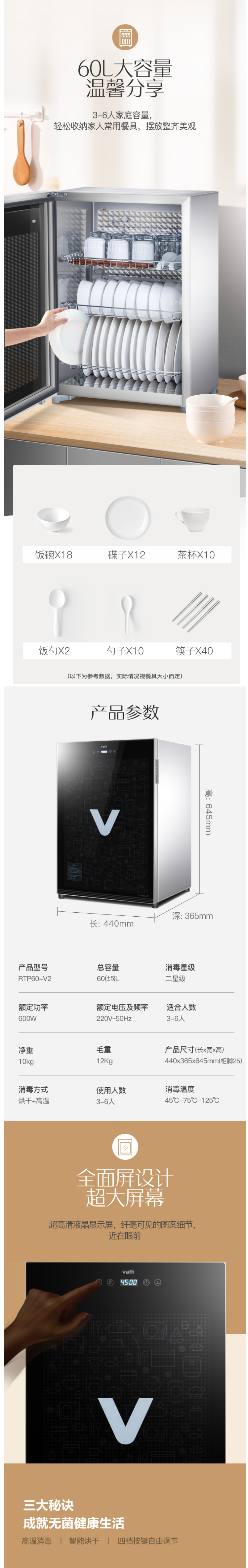 这款华帝 RTP60-V2 台式迷你消毒柜,容积是60L,二星级杀菌,能杀灭顽固性病毒及细菌,陶瓷碗筷、玻璃餐具、金属器皿消毒都可以使用,