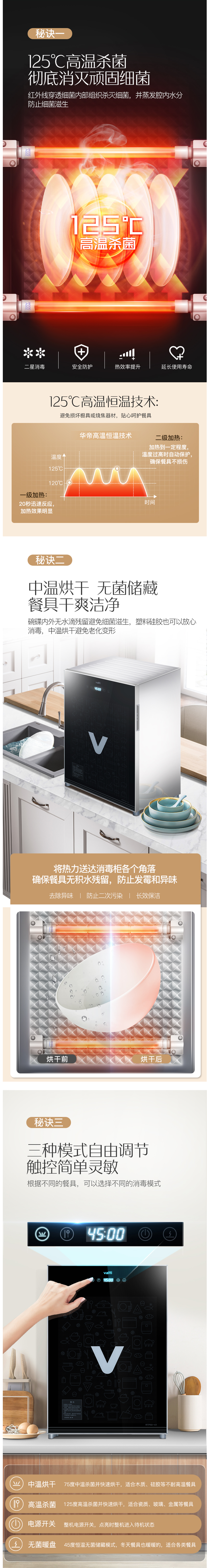 两种杀菌方式:上层是循环系统3D立体杀菌,快速分解细菌细胞,360度循环杀菌无死角;下层是125(-10+55)℃红外线光波消毒,通过红外线发热管可以释放出消毒光波,在恒温下快速杀死各种顽固细菌;