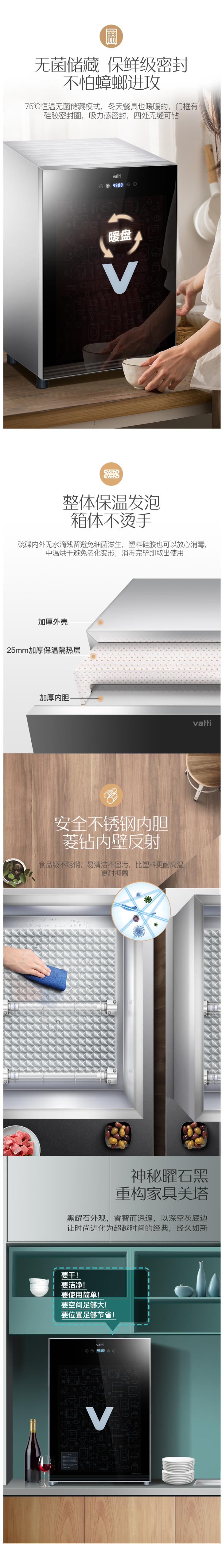 消毒柜内胆的上下盖都采用了漫反射工艺,快速、全面、均匀的杀菌消毒,同时自带的智能温控系统,节能省电;表面是特种镜面镀膜工艺,更耐高温且光亮如镜面;磨砂质感包边,兼顾耐用,抗腐蚀性强,持久如一;智能断电停机技术,无需等待,一键开启消毒,完成后机器会自动断电停机,尺寸:长440*深365*高645mm。