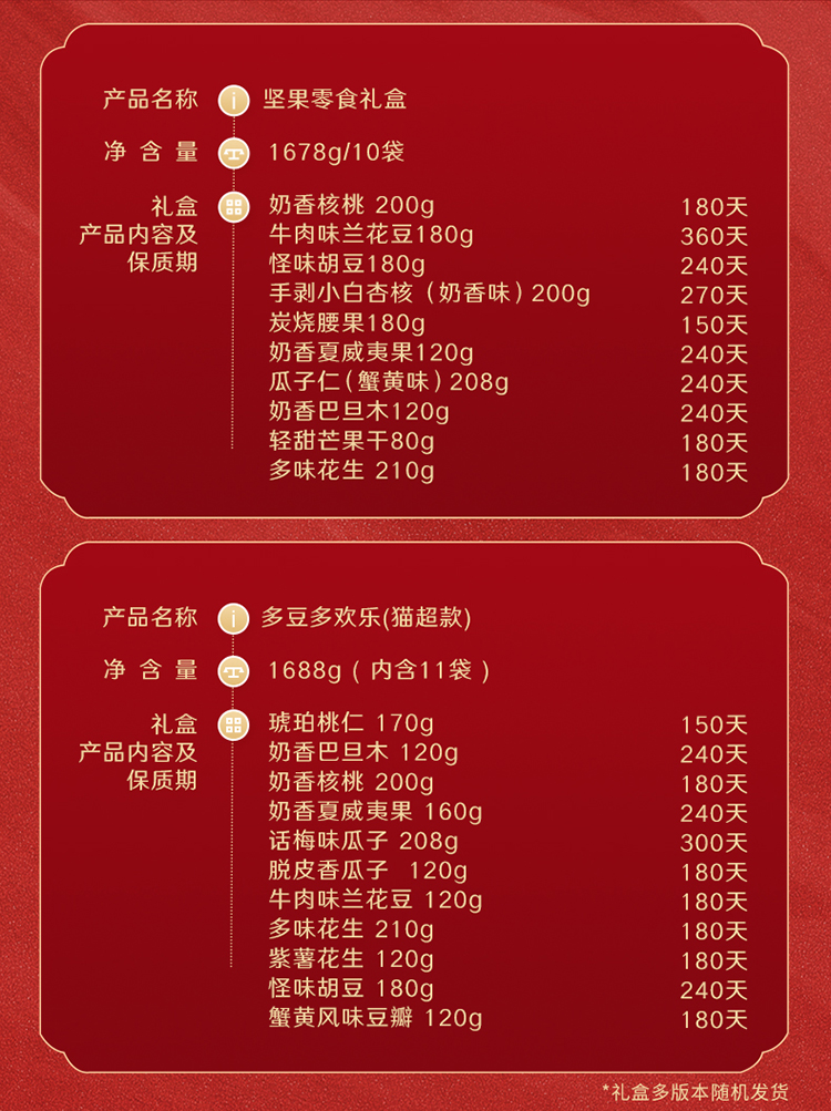 这款良品铺子 坚果礼盒,共11袋/1168g,包括琥珀桃仁 170g、奶香巴旦木 120g、奶香核桃 200g、奶香夏威夷果 160g、话梅味瓜子 208g、脱皮香瓜子 120g、牛肉味兰花豆 120g、多味花生 210g、紫薯花生 120g、怪味胡豆 180g、蟹黄风味豆瓣 120g。