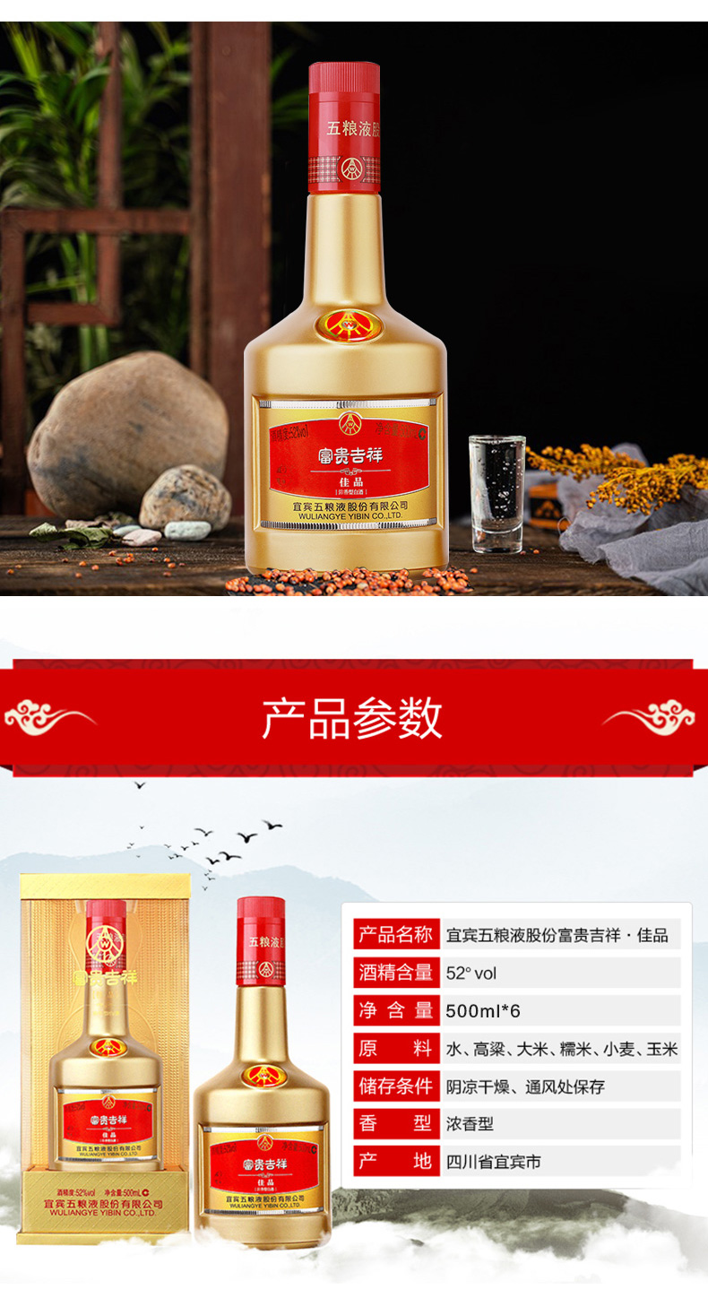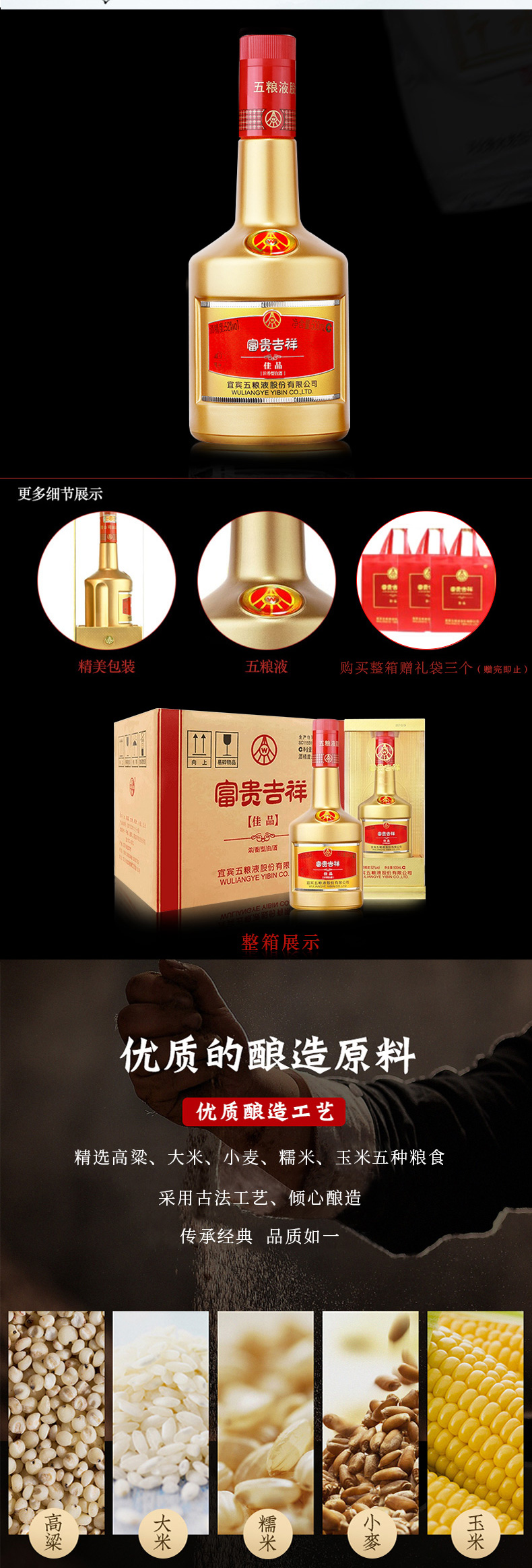 这款五粮液 富贵吉祥佳品,土豪金装 52度 浓香型白酒,是宜宾五粮液股份有限公司出品,属于五粮液系列酒,在五粮液总部四川宜宾生产,但没有五粮液那么贵,但品质还不错。