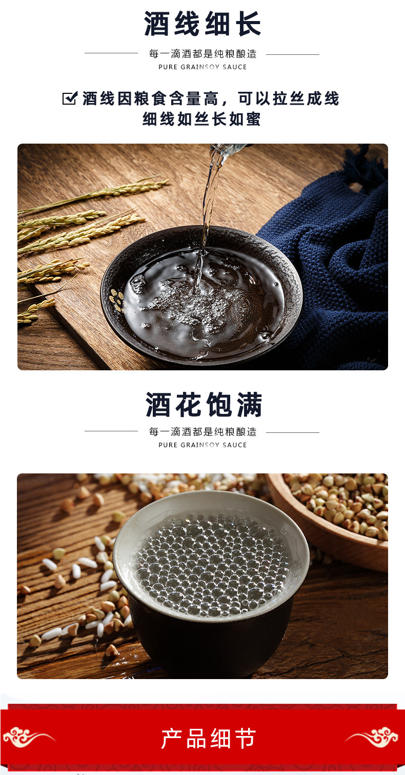 与五粮液同工艺、同窖池生产,用水、高粱、大米、糯米、小麦和玉米酿造而成,酒香气扑鼻、酒质清澈,口感绵柔回甘不上头、不易醉、醒酒快,酒精度为52%vol。