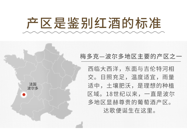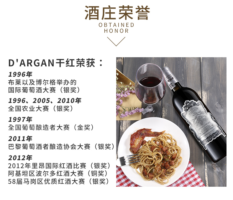Château d'Argan达歌酒庄位于梅多克中心地带,占据了纪龙德江入海口一端,地处这个历史产区的最高点,毗邻Saint-Estephe和Pauillac产区,其独特的土壤有这深层的粘土,再加上优良的微气候,非常利于葡萄的生长。Château d'Argan达歌酒庄曾荣获2012年里昂国际葡萄酒大赛铜奖,1996年、2005年、2010年巴黎农业大赛银奖,1997年、2011年巴黎葡萄酒者酿造协会大赛金奖,1996年国际葡萄酒挑战赛银奖,2012马扎葡萄酒大赛银奖。