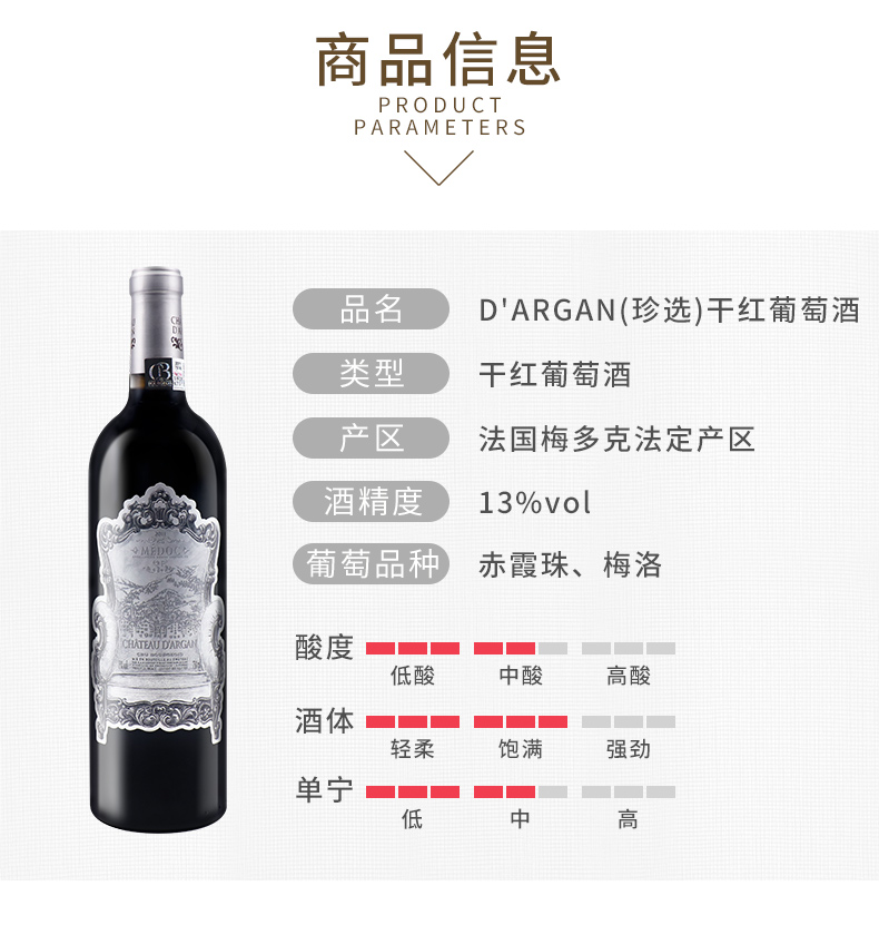 这款Lamont 拉蒙 达歌酒庄(珍选)干红葡萄酒,规格:750mL,法国原瓶进口,由Château d'Argan达歌酒庄生产,产区法国波尔多梅多克法定产区,AOC等级,由柔滑的梅洛和刚强的赤霞珠混酿融合,采用35年黄金老藤,酒体复杂醇厚,经12个月的橡木桶陈酿,造就了温润均衡的口感,酒体稳重沧桑,夹杂着丰盛果香,蓬勃而优雅,回味厚实绵长,酒精度13%Vol,年份2014年,净含量750mL/瓶。