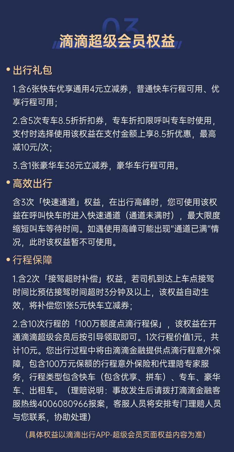 滴滴出行超级会员月卡,含6张4元快车立减券、5张专车8.5折券、1张豪华车38元券、3次快速通道、2次接驾超时补偿、10次点滴行程保,总价值168元。