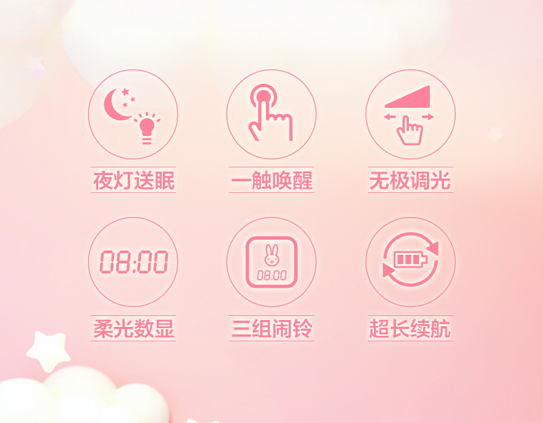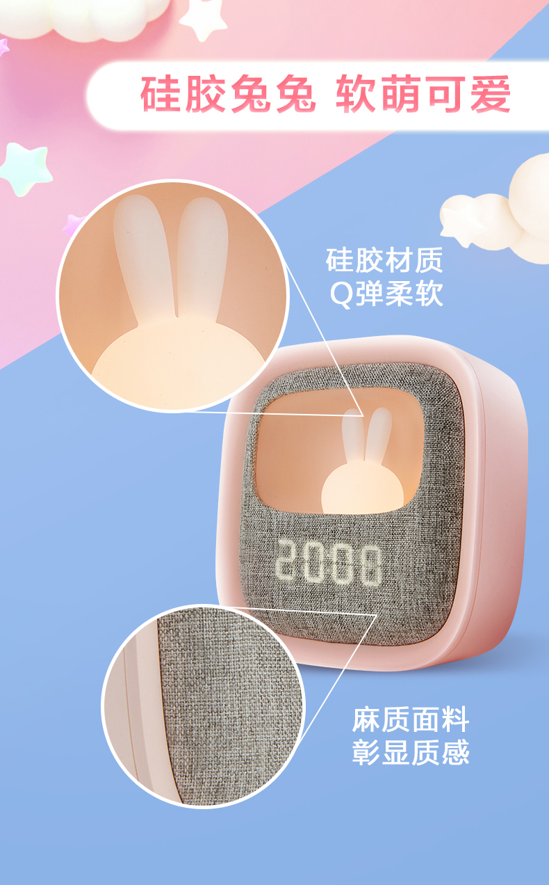 这款Philips 飞利浦 害羞兔床头灯,3000K柔和灯光,陪伴孩子晚间时光,轻触按键打开灯光,长按可调节灯光到最舒适的亮度。30分钟助眠模式下,灯光逐渐变暗直至熄灭,温柔陪伴孩子入睡。三组闹钟设置,超长续航,充电3小时,使用1个月。