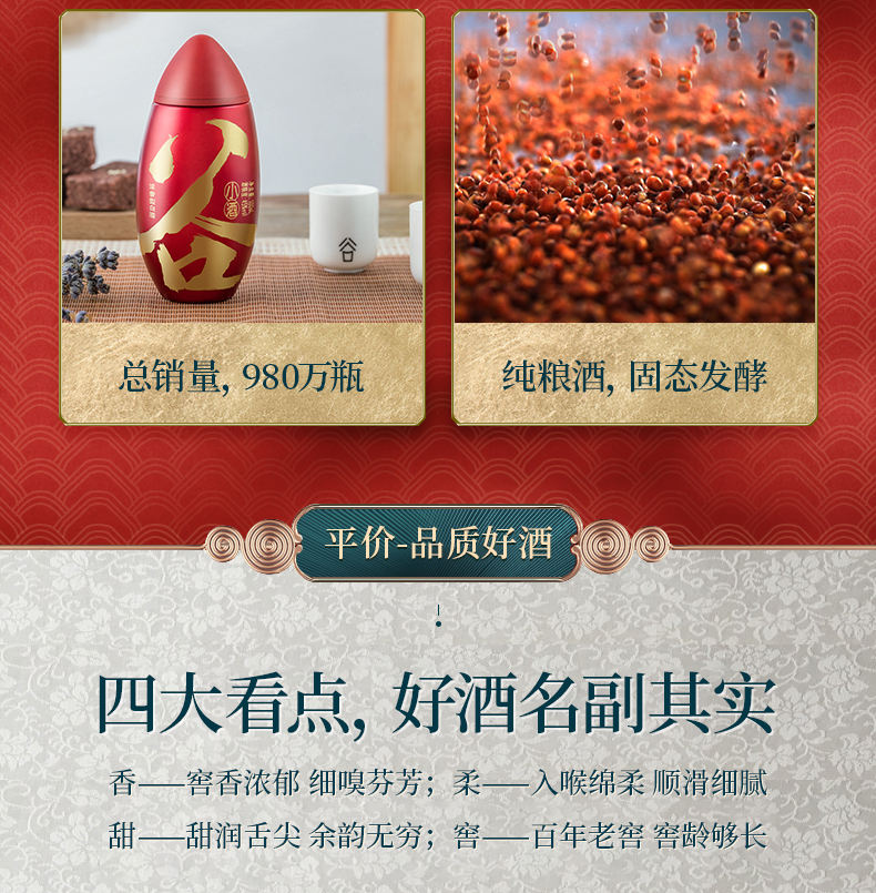 这款红米粒精选五粮精酿,百年古窖池大曲固态发酵,富含单宁、花青素,五年基酒贮藏,三十年老酒调味,45度绵柔浓香,闻香优雅,口感好不上头。
