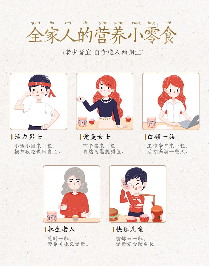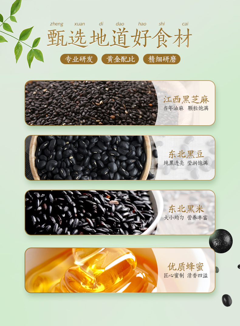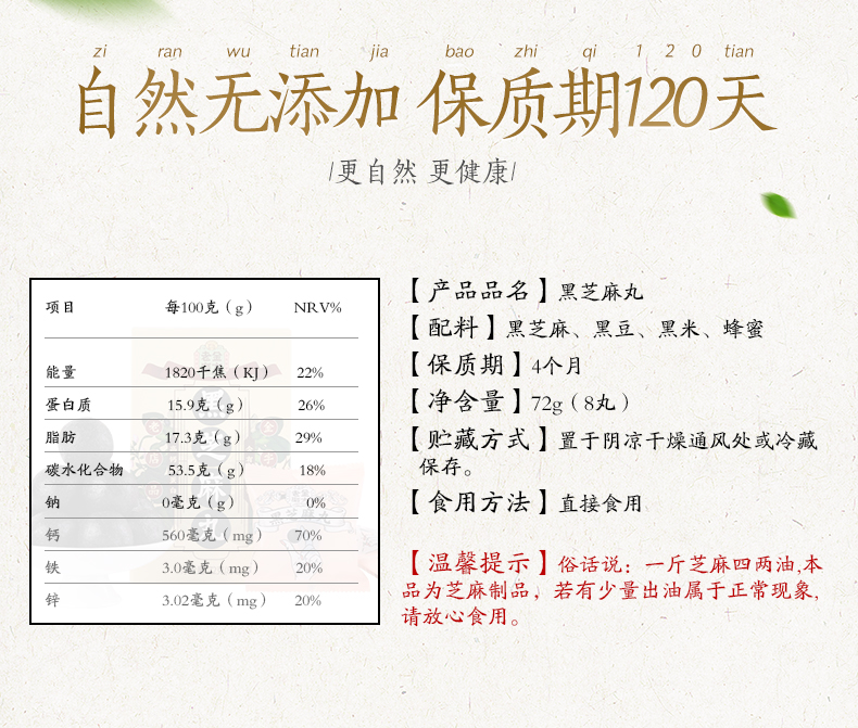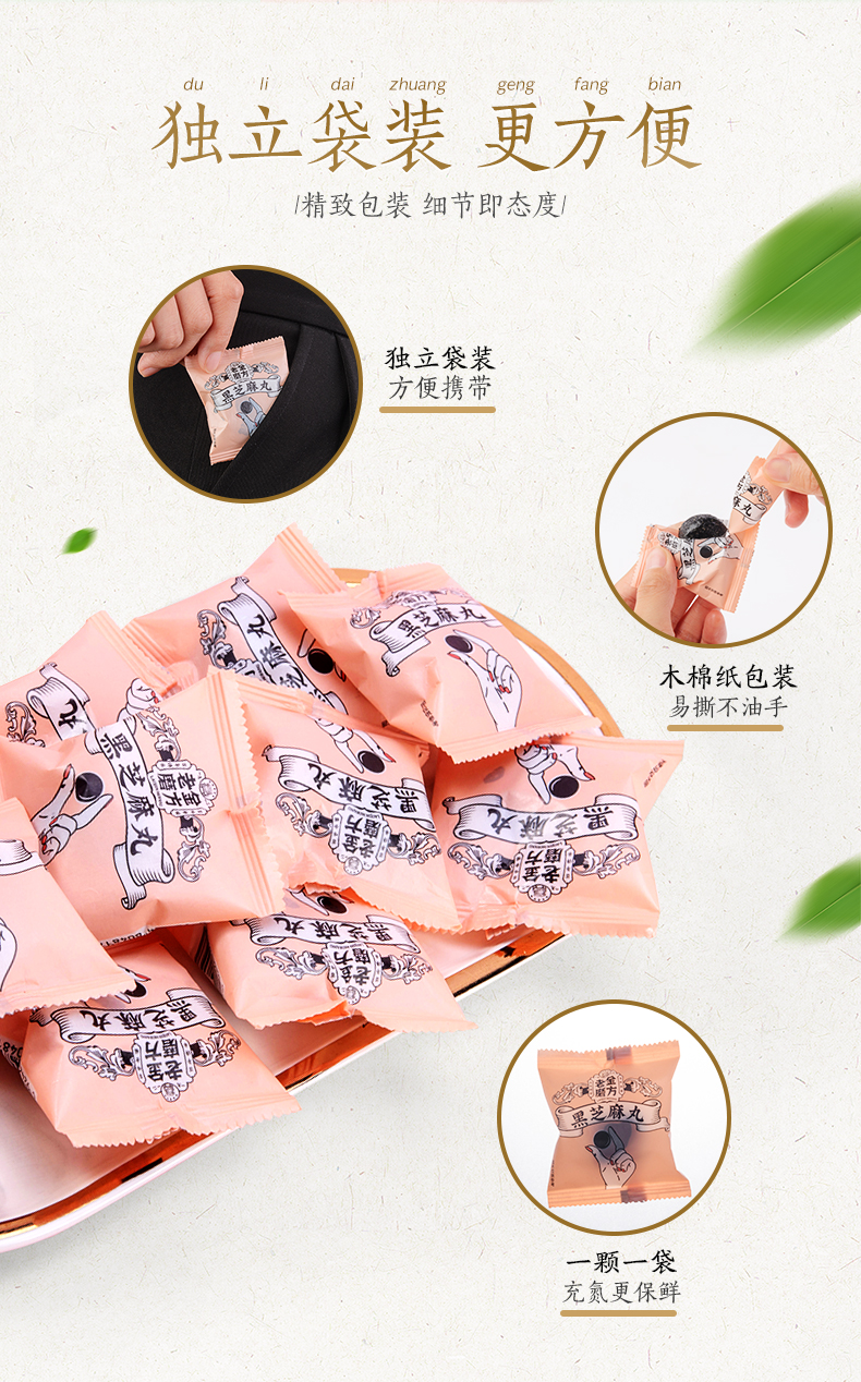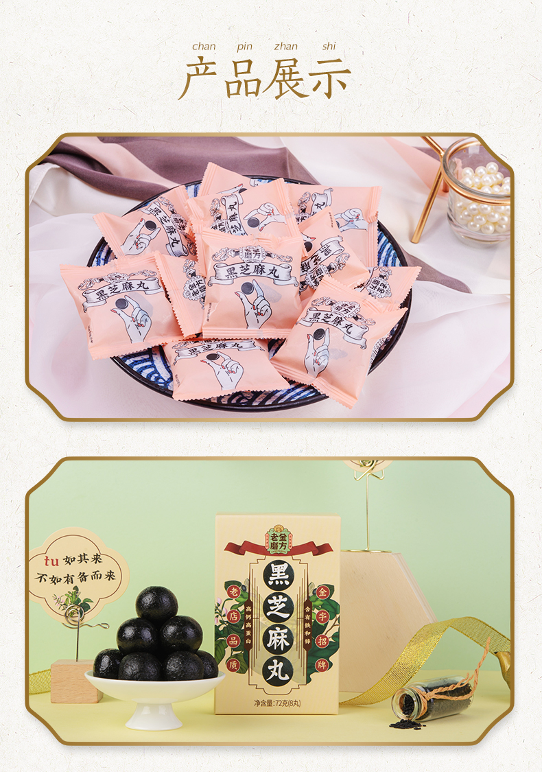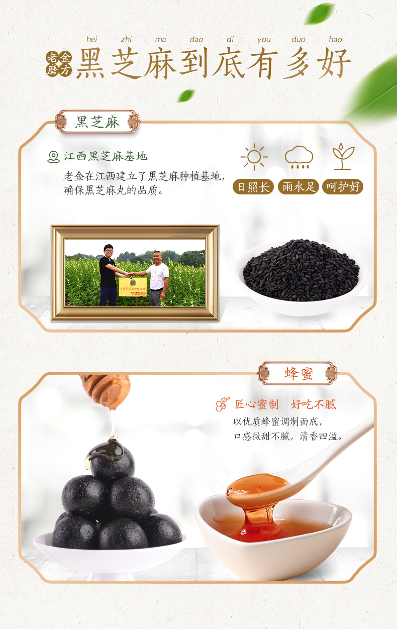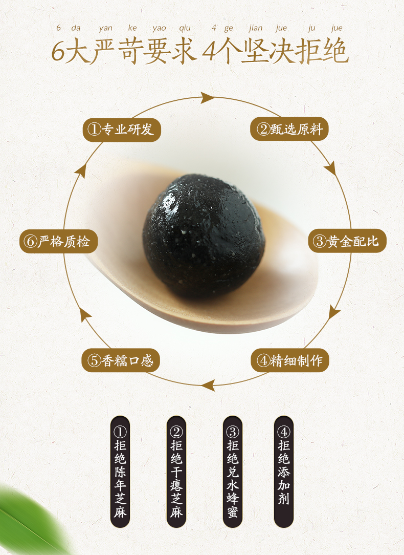 选用当季黑芝麻,颗粒饱满,干净无杂质,香脆美味,清洗后高温烤制需要把握精准的火候;用蜂蜜代替糖调制蜜丸,口感稍甜却不腻,蜂蜜清润细腻,不粘牙。