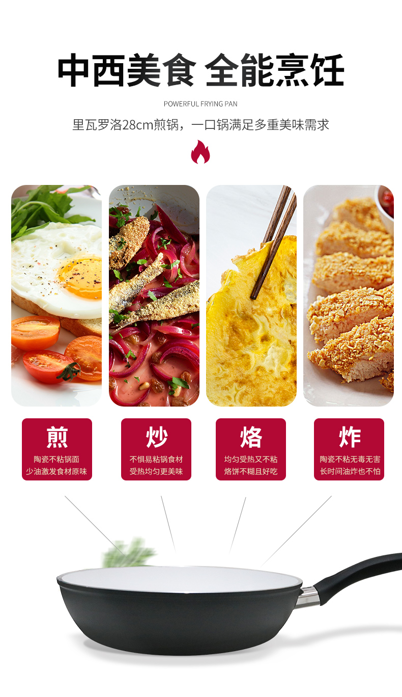 这款巴拉利尼 陶瓷不粘炒锅,意大利原产,锅口直径为28cm,深6.5cm,内里采用陶瓷不粘涂层,非化学涂层无毒,高温无有害物质析出,无毛孔更少细菌残污,在无油情况下煎蛋,锅面也不粘。