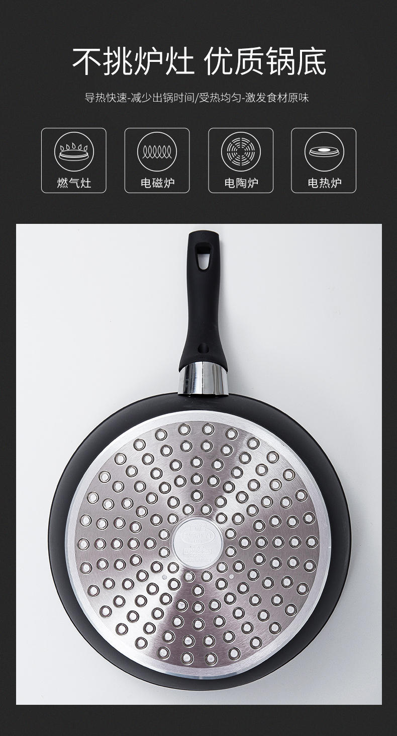 优质复合锅底,燃气灶、电磁炉、电陶炉、电热炉都能使用。电木防烫手柄,握感舒适,防烫隔热;在锅手柄处使用了红绿聪明感温点专利技术,通过颜色变化控温。