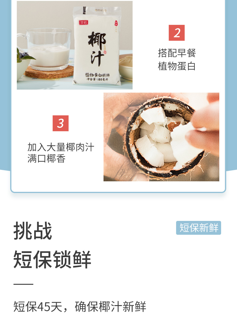 这款菲诺纯 生榨新鲜椰汁,规格:180ml*10袋,鲜椰现榨,加入原生椰子水,椰香浓郁;不添加香精、色素、防腐剂等,短保45天,确保椰汁新鲜;满口椰香,清甜不腻。