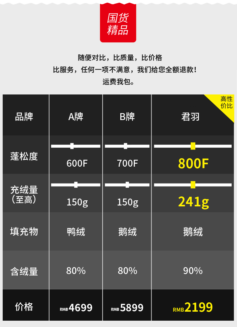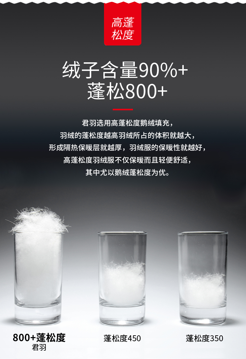 「鹅绒」800蓬鹅绒成本约是普通鸭绒的10倍,没有鸭毛的腥味,保暖效果更好:「210克 800蓬鹅绒」≈「272克 389蓬普通鹅绒」≈「388克普通鸭绒」。