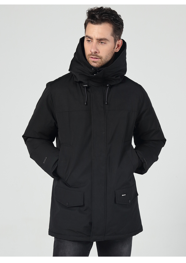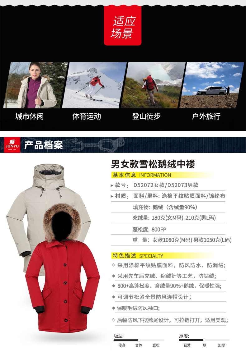 这款君羽雪松中长款羽绒服,属于酷寒款,可抗-15℃~-30℃,是2019年的冬季新款,内里填充了800蓬90%鹅绒,充绒量男L码210克/女M码180克,属于重装羽绒服了,外层是贴膜防绒布面料,可防风防雨雪。直筒微收腰版型,长度过臀及大腿。