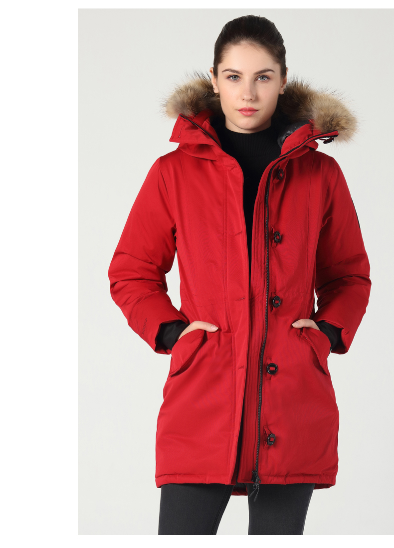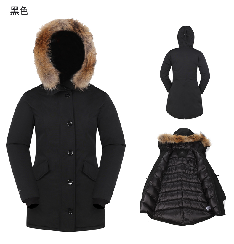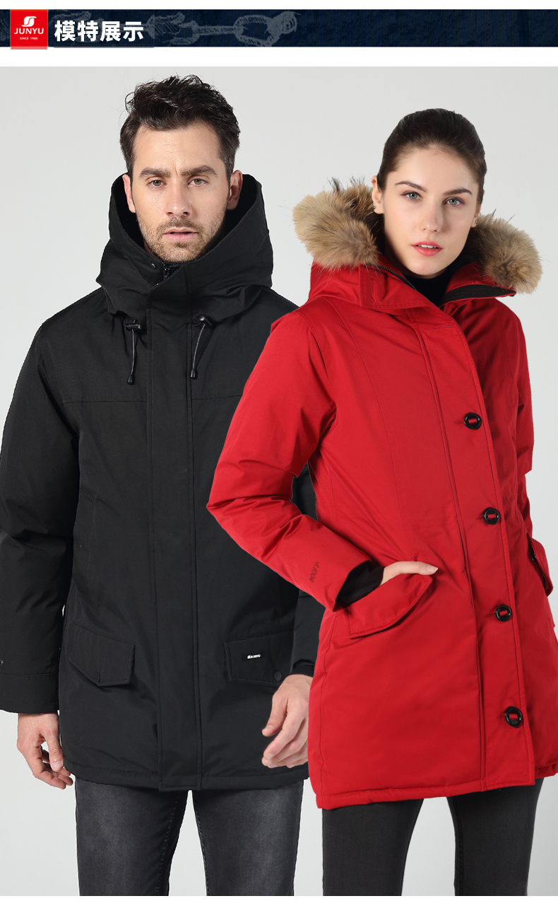 在款式和细节方面,男直筒/女修身版型,羽绒服是连帽设计,女款帽檐一圈有用拉链连接的大貉子毛领,后下摆有拉链,可拉开。双头主拉链和纽扣组合的双门襟,有着更好的保暖效果,所有拉链都是YKK的,防风保暖袖口,帽子用魔术贴调节前后幅度。