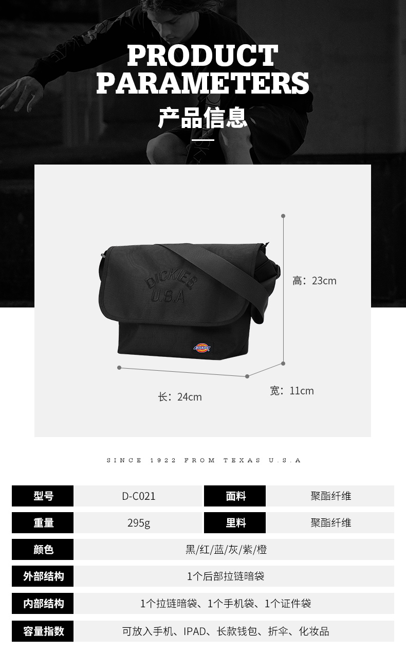 天猫dickies鼎骏专卖店169元,可领100元优惠券,实付69元到手。这款Dickies 帝客休闲斜挎邮差包,采用高密聚酯纤维,防日常溅水,坚固耐用,塑料插扣,品牌logo印花,魔术扣前置袋,后置暗袋。可轻松放入手机钱包、零食等户外旅游所需物品。