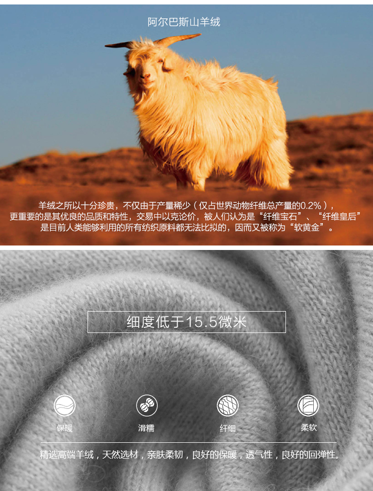 ▲此款羊绒衫选用小于15.5微米的高档A级羊绒