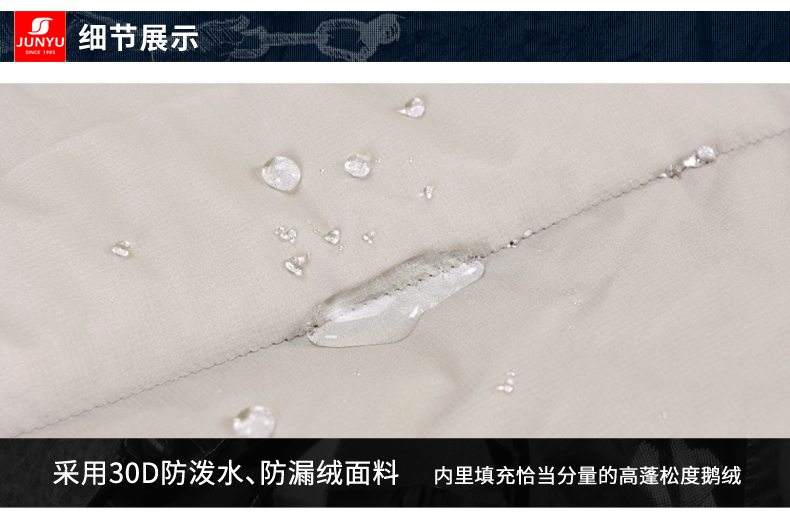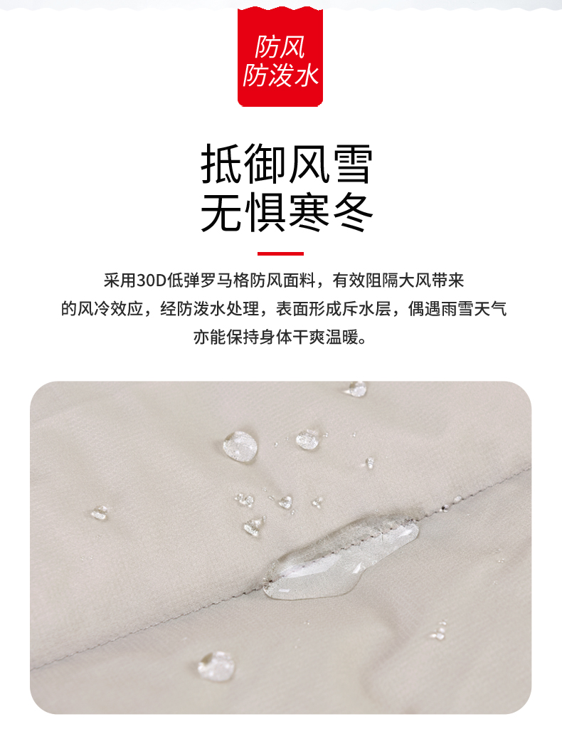 外层面料上,使用30D低弹罗马格面料,防风防泼水,可以长期保持面料干爽、洁净。羽绒采用先车出羽绒隔舱后充绒的方式,缩绒针细针眼搭配粗线的防钻绒工艺。