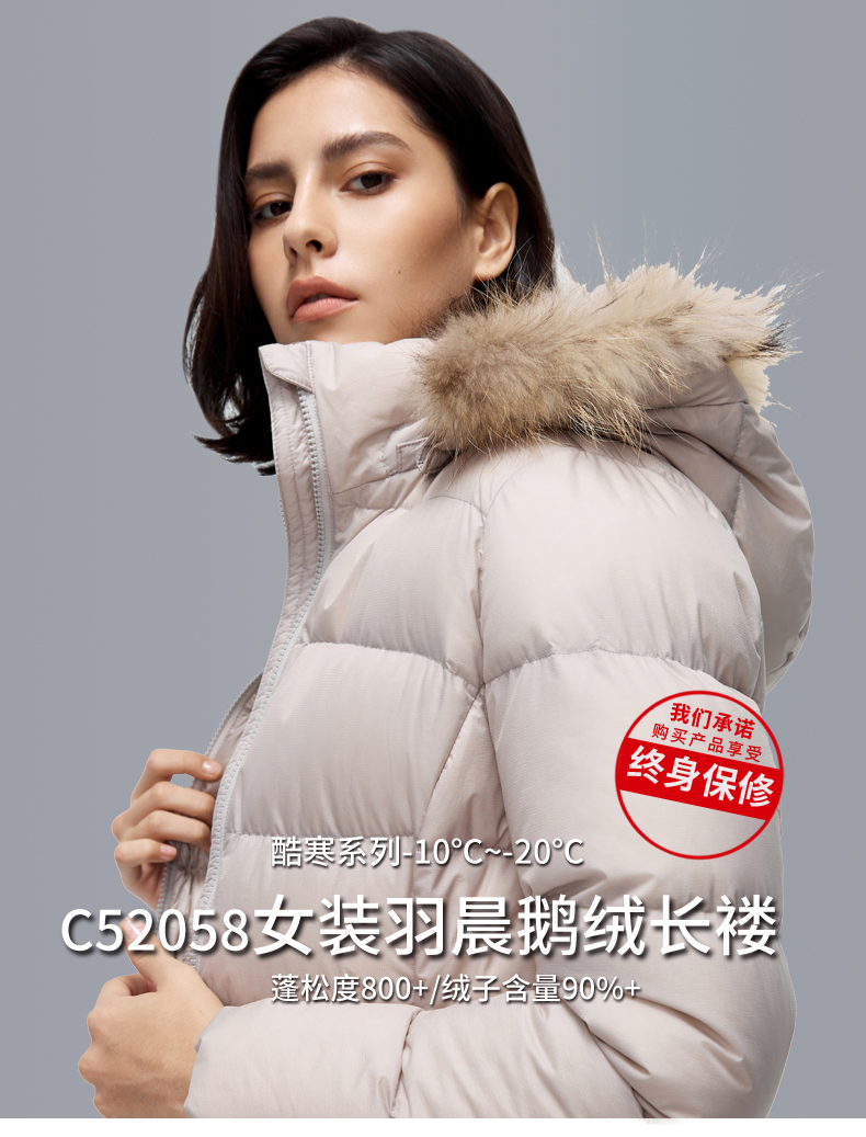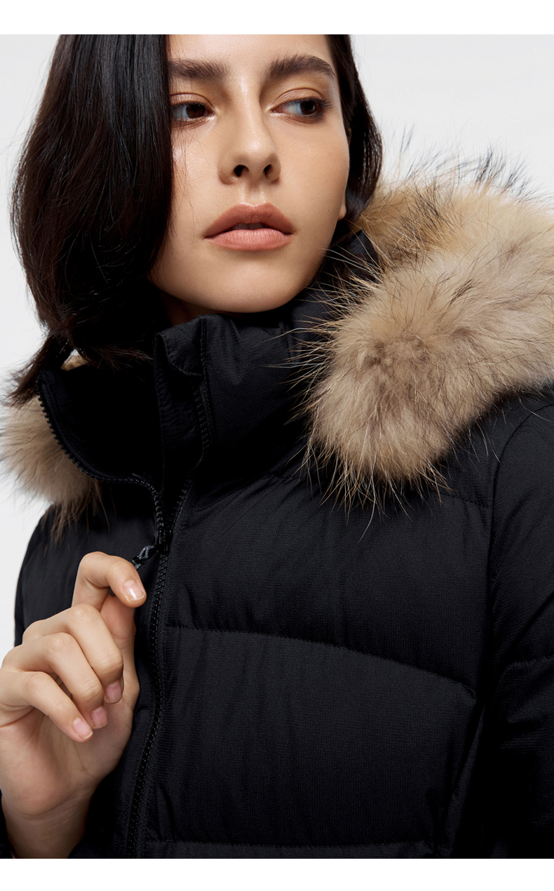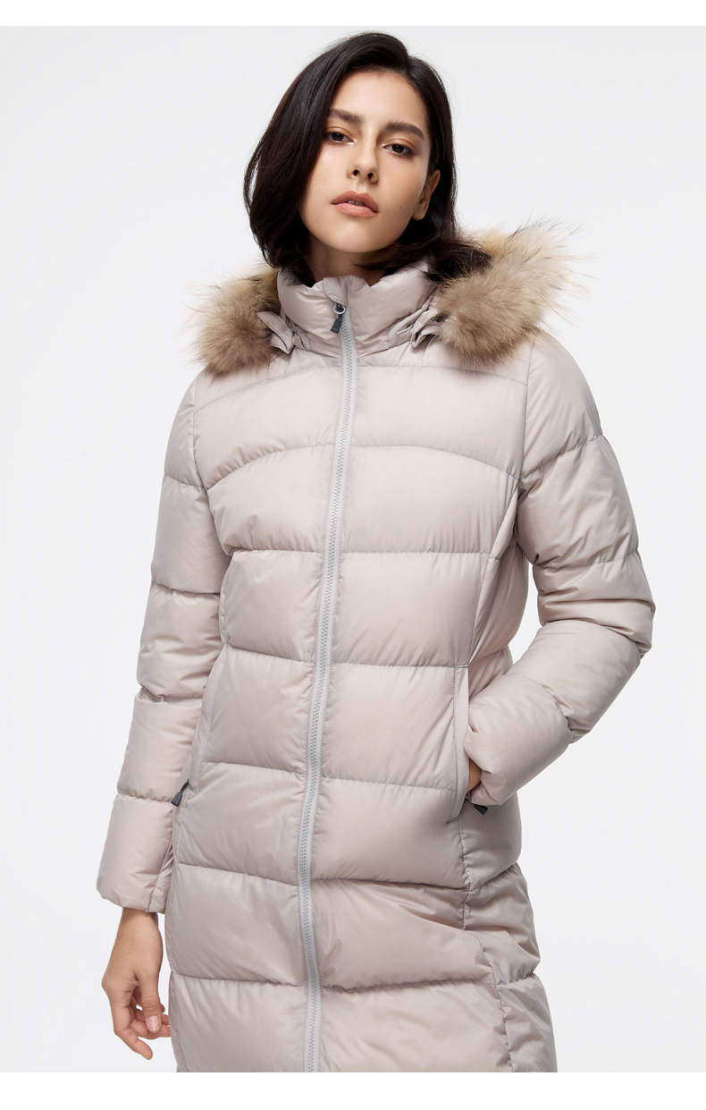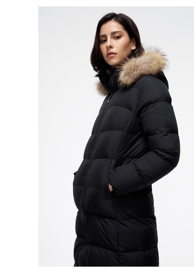 这款君羽羽晨女士羽绒服是过膝长款,加上修身版型设计,除了非常保暖外上身效果也特别好。内里填充的是800蓬90%鹅绒,M码充绒量179克,属于中等厚度。采用30D低弹罗马格防水挡风面料,防水挡风防漏绒,适合0℃到-15℃穿着。