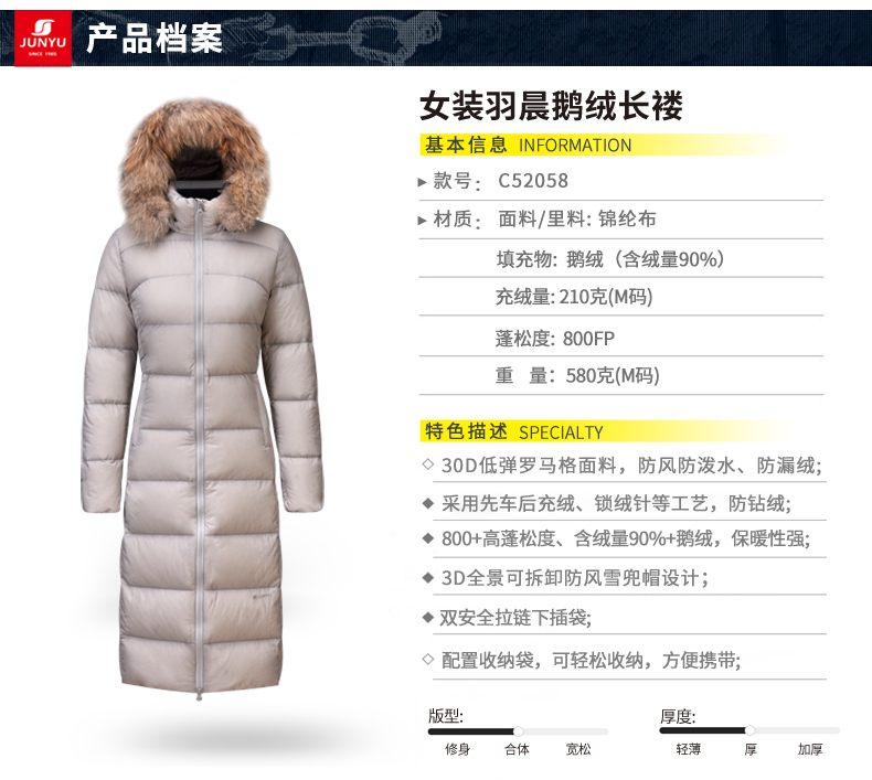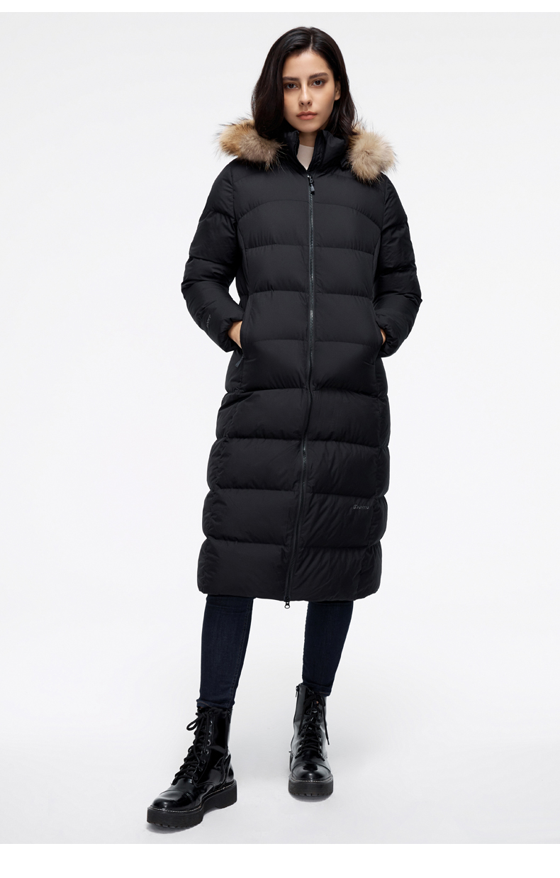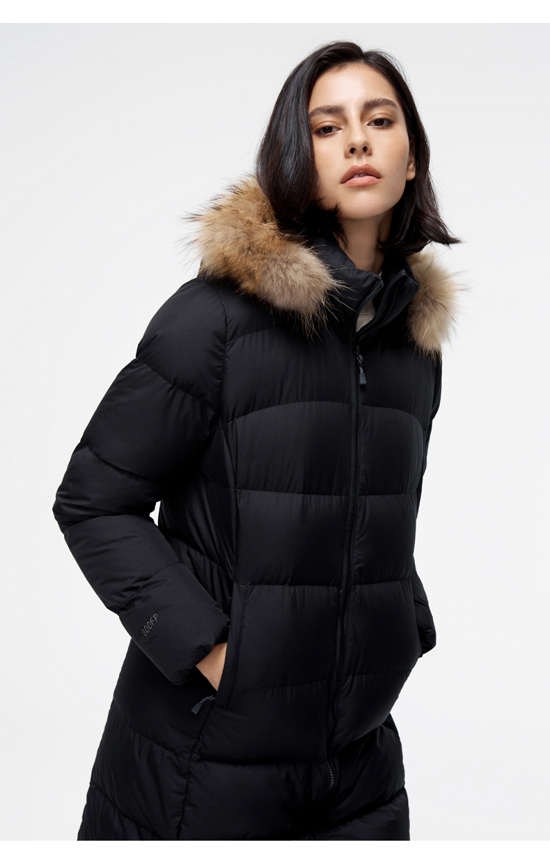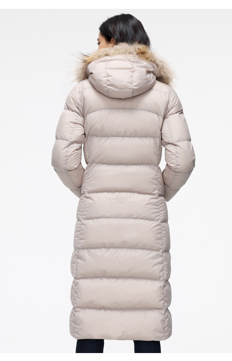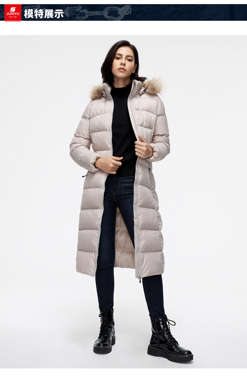 这款君羽羽晨女士羽绒服是过膝长款,加上修身版型设计,除了非常保暖外上身效果也特别好。内里填充的是800蓬90%鹅绒,M码充绒量179克,属于中等厚度。采用30D低弹罗马格防水挡风面料,防水挡风防漏绒,适合0℃到-15℃穿着。
