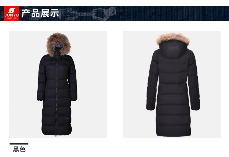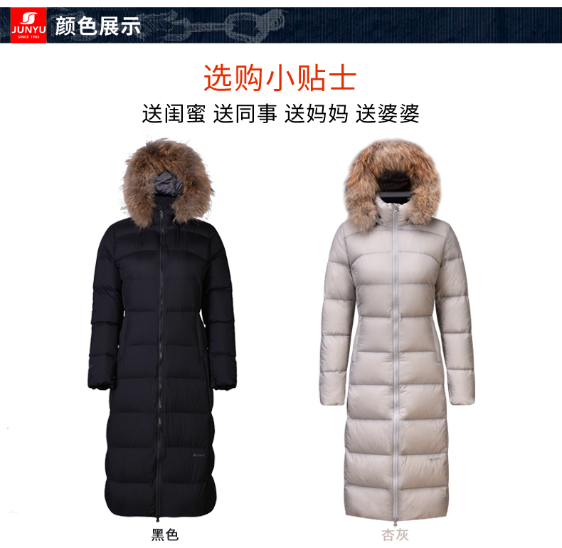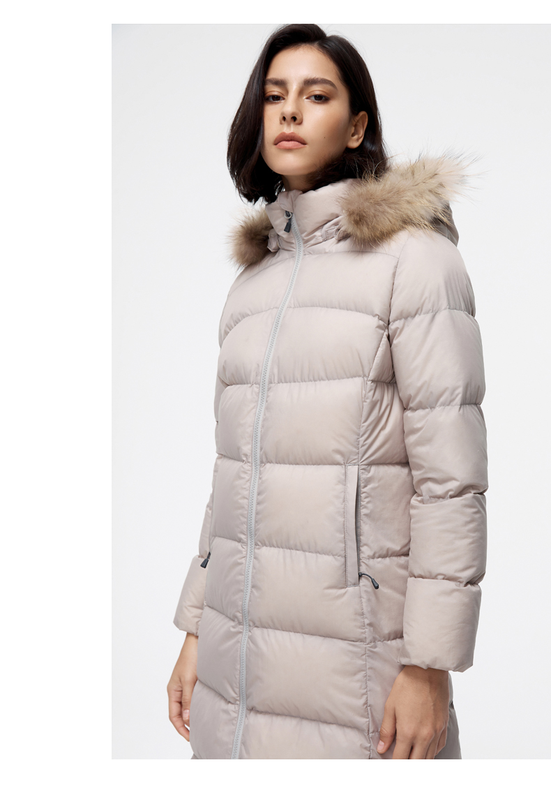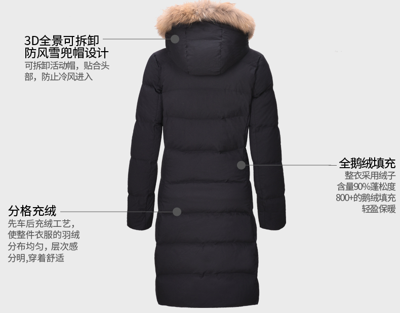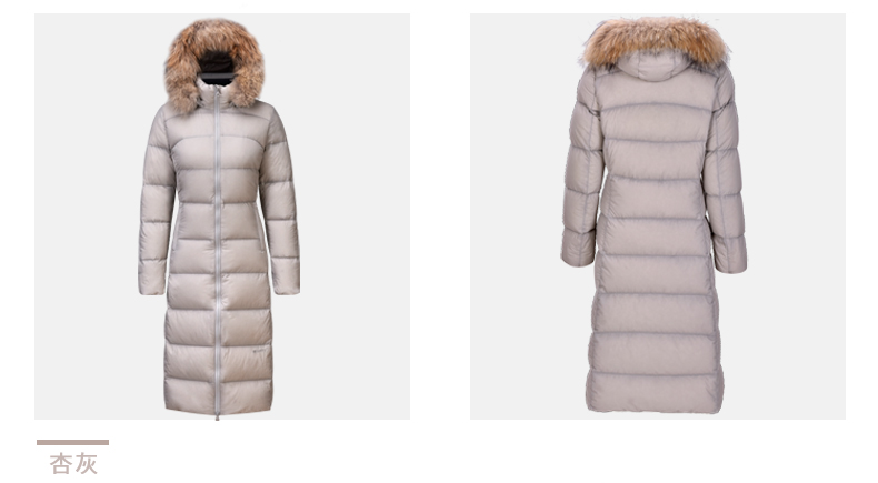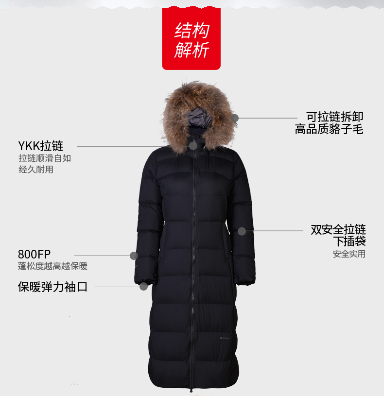 在款式和细节方面,修身版型,衣身长度过膝盖;可拆卸3D全视角防风雪帽,帽檐一圈有用拉链拆脱的大貉子毛领;双头主拉链和钉扣组合的双门襟,有着更好的保暖效果,所有拉链都是YKK的,防风保暖袖口。